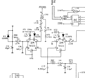 To me, the reset circuit seems to be needlessly complicated. At first it seemed like the LS161@2L could be the issue – except Pin1 and 9 were being pulled low. I removed it to divide and conquer the problem. The LS161 was good and the /PONRES (Power on reset) was low. Spent some time on the /PONRES circuit and the only thing that made sense was the 74123 was bad. Removed it and my tester said it was good. This is where having another Popeye board would have been helpful. Even if it didn’t work – they all die differently. I checked my dead Donkey Kong board and this circuit seemed to be different but it had a 74123 – so I borrowed it (never ran into the chip before). It did fix this circuit however. It now holds the /PONRES line low for just half a second or so before going high. Sometimes the testers say chips are good when they are not.