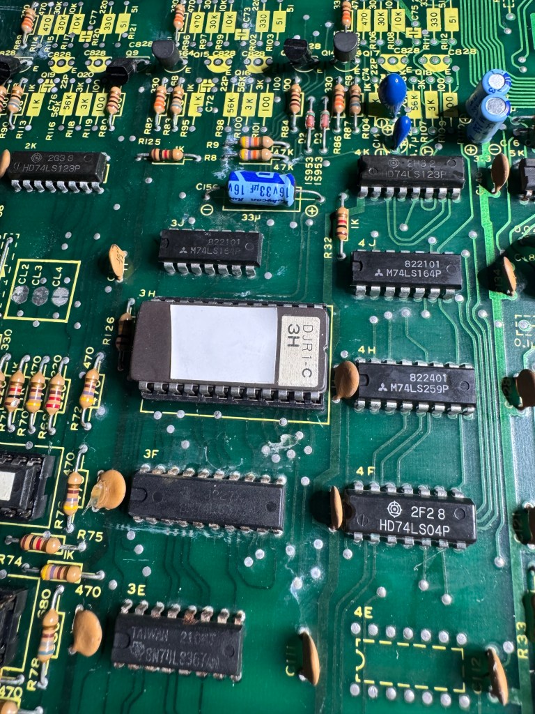 During this ‘discovery phase’ I worked on an FPGA Tester config and set up ROM and RAM tests. The memory map shows lots of RAM segments, but the only testable range was x8C00-x8FFF. I got that to test good (for a while).. The ROMs were jumping all over the place.. Even pulling them returned odd checksums vs. stable ’empty socket’ checksums. Determined the PLA(74LS367@6H) was bad. Replacing it stabilized the checksums – but they kept coming back different than the actual ROMs. (I believe this is from a copy protection scheme where they flip bits to prevent pirating, etc.) While getting the ROMs to read correctly, the RAM@7H stopped reading. Checking the chip – /MEMWR was not functioning. Tracing backwards – the LS04@4K had died – it was a Fujitsu.. Replaced it and the RAM was testing good again.