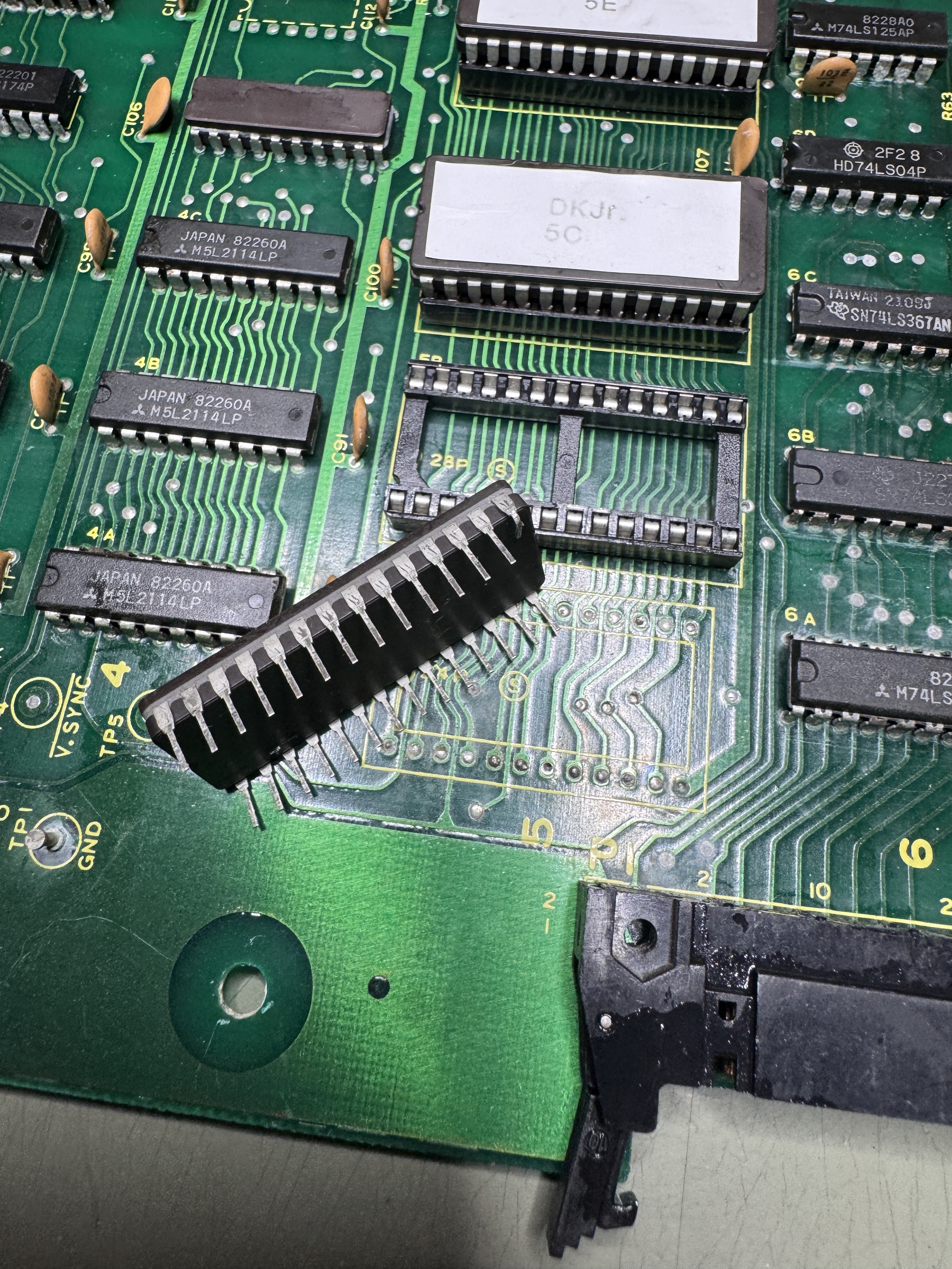 First – the EPROM@3H was backwards (and ruined).. It is the sound ROM.. Burned a new one. While cleaning chip legs – I found a number of ROMs with legs that had been bent under.. It’s possible they were touching… But not sure. All of this got corrected up front. I downloaded and verified all ROMs since DK does not have self test.