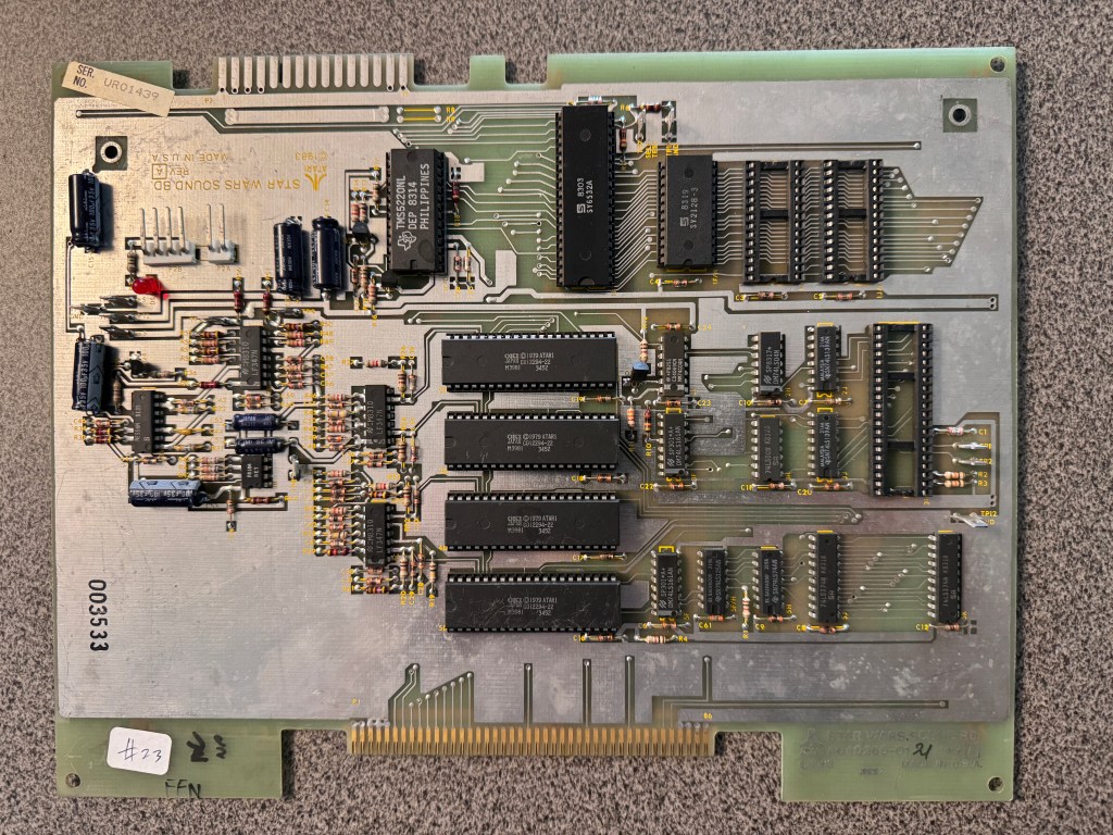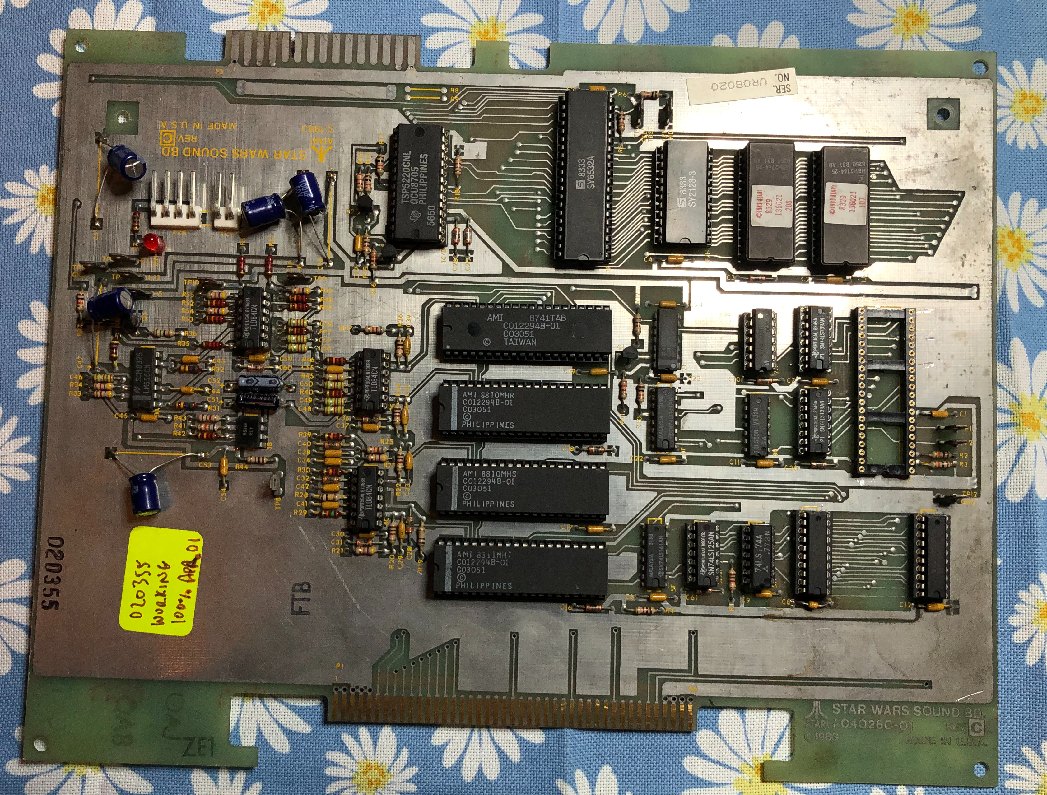 Last was the sound board – I’d replaced all the leaky caps. Sounds worked, but the speech was just clicking. I went back and forth on this one swapping in a new voice chip (turns out I got a handful of bad ones..) – the CD4069 chip was bad and restored the voices. Original voice chip was good!