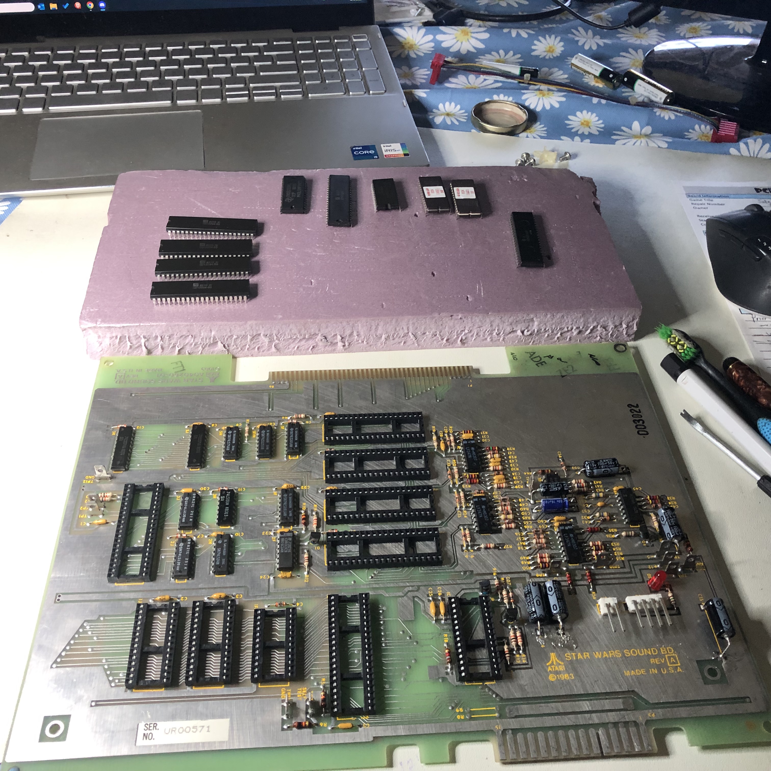 However – I decided to do a quick test in my cabinet and then found the sound was messed up.. Jumped the gun.. Back on the bench the sound board would reboot and fail for 30-60 seconds. A reset or toggle to diag and back would generally clear it.. This means a chip has a thermal failure. I’d swapped out the socketed chips with my reference board and there were no changes. Sound board was resetting.. During this I had pulled one of the ROMs and then reseated it (a couple times) and found the resetting became a lot less random and got consistent in it’s duration.