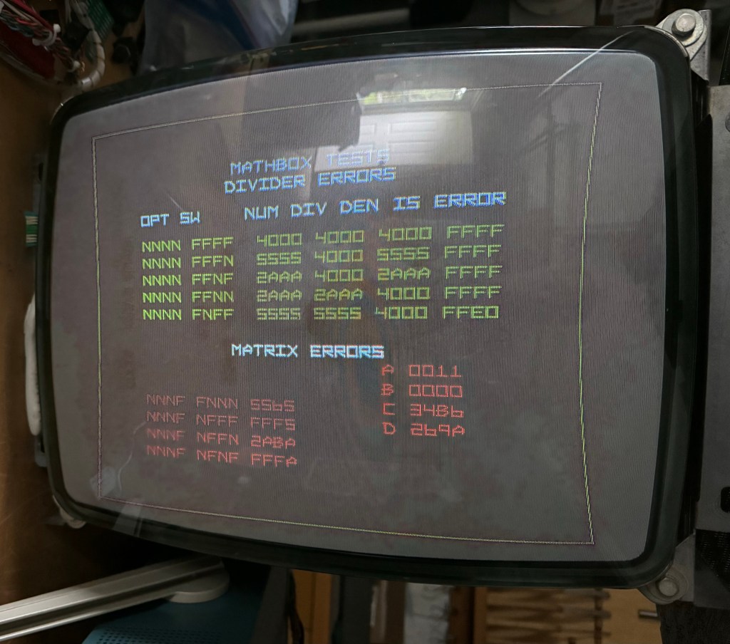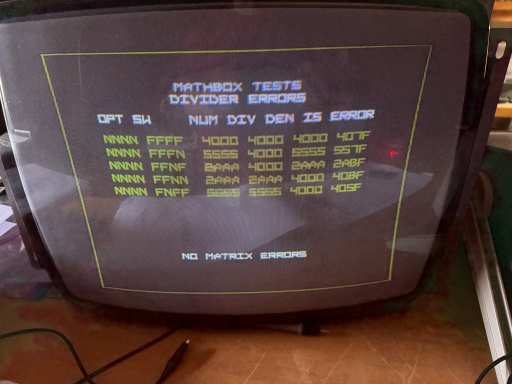 Further testing and cross checking – LS374@4M and LS83@4N cleared out 2 error lines in the diag screen. Mixed in here was an LS175@4P. I lost track of the order of error clearing at this point. I did pull and put back the LS299@7M – It gave a false positive. The final chip that cleared the last of the Divider errors was the LS374@5M. Finally! I chased this in circles for a while. All Mathbox tests were good at this point. All DIAG screens were good. RAM good, ROM good, VG good.