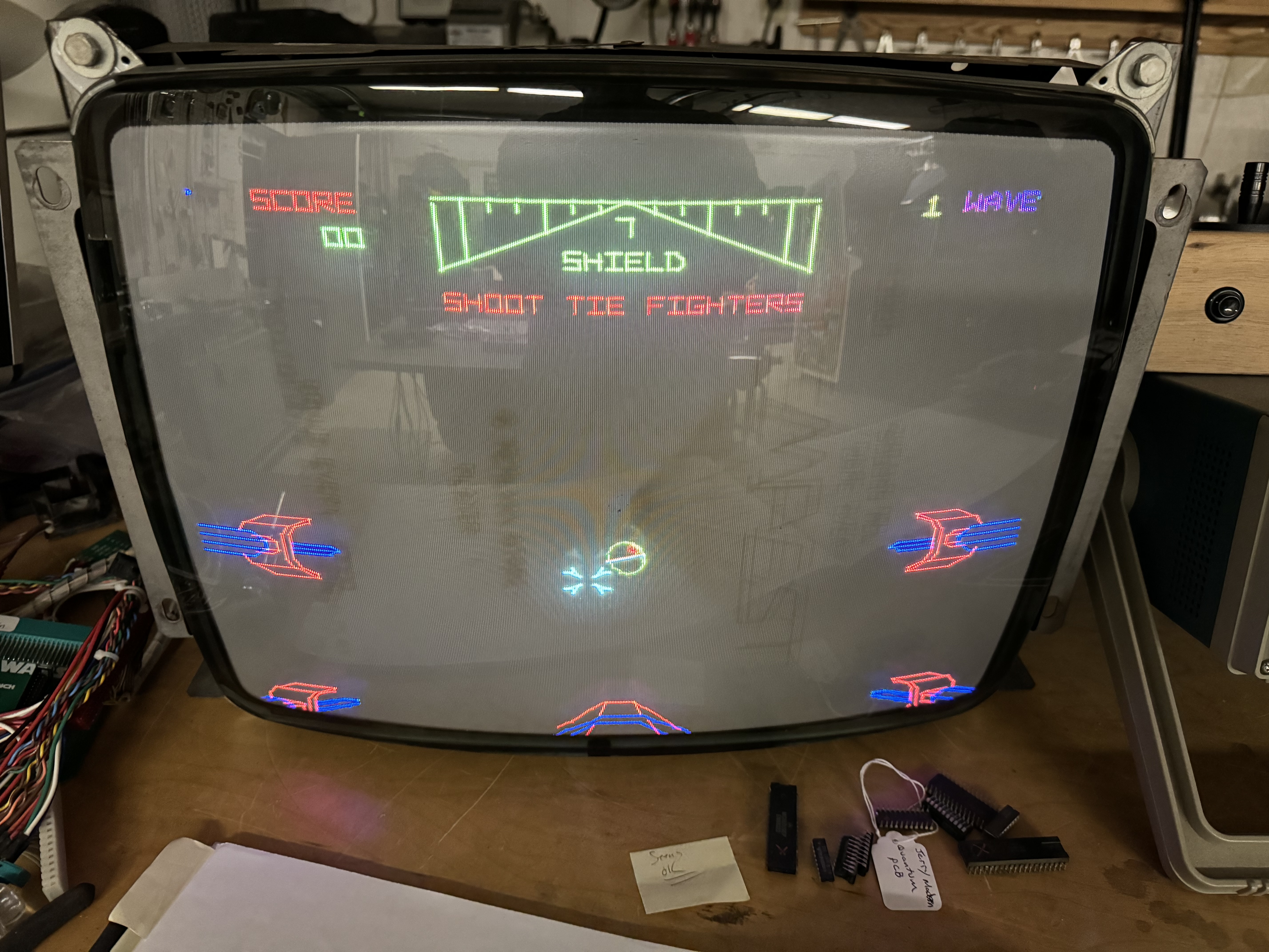 This one started out as a real head scratcher – up to this point it all seemed good and the boards had stabilized. It took a few tries but I realized the vector generator was failing at the exact same point. It failed when the Easter egg ‘MAY THE FORCE BE WITH YOU’ is first rendered completely and isn’t a set of dots.