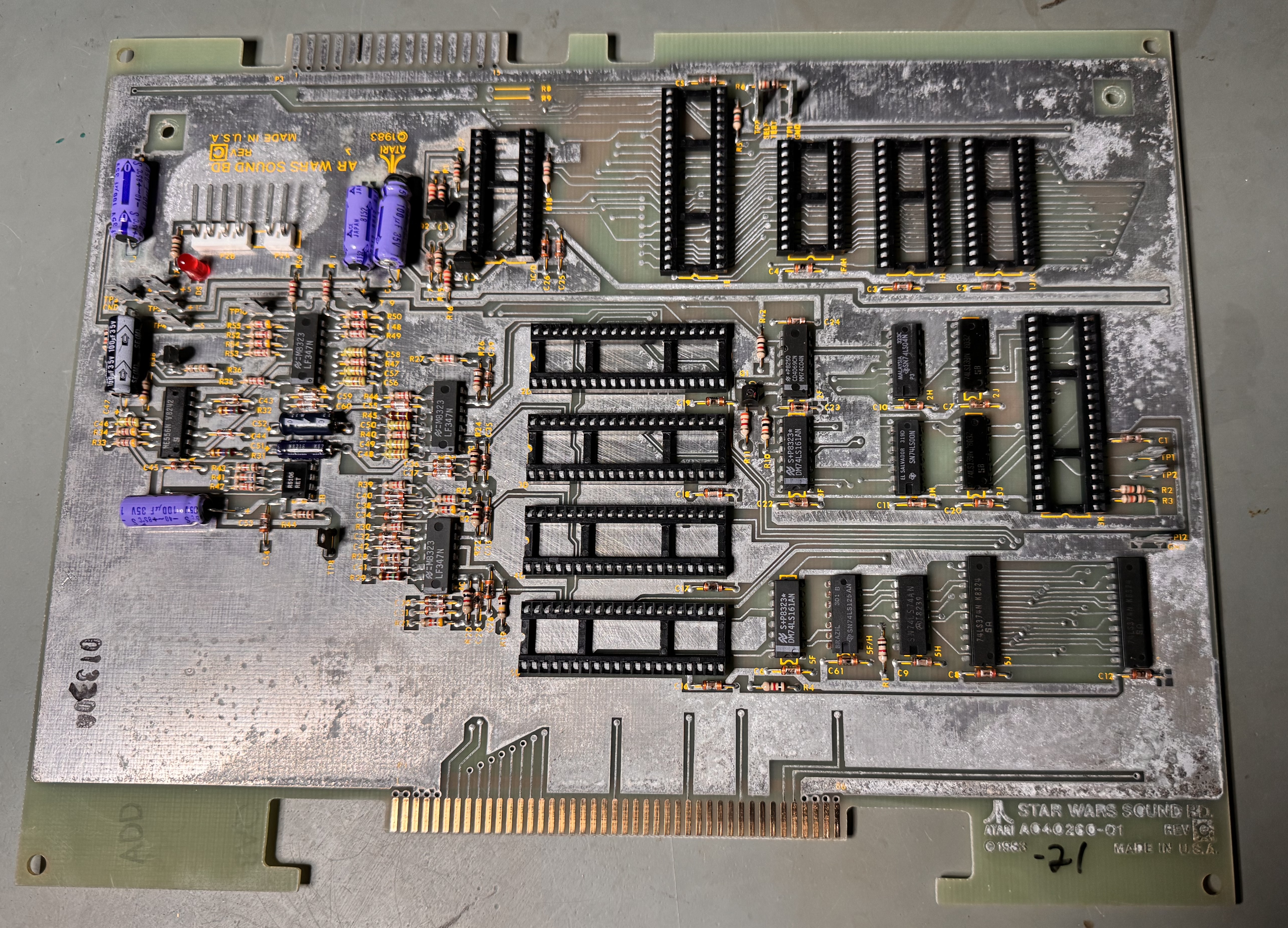 Pretty clean looking board – missing the CPU. Once I focused on it for a while it had the following issues. 3 bad pokeys (ouch) and the sounds were very faint – but I could get it to generate all of them. If I removed the TL084@3C I would get normal volume.. really? It was not the problem.