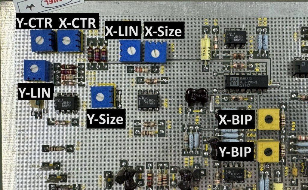 As with all purple caps on SW sets – these were leaky and got replaced. The two black pots X/Y linearity were all chewed up and nearly unusable. They got replaced. The AVG chip was also missing. A little cleanup and testing.