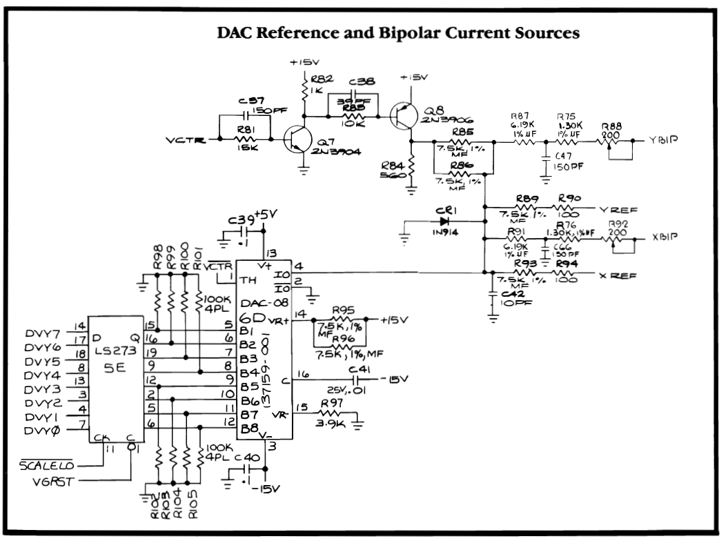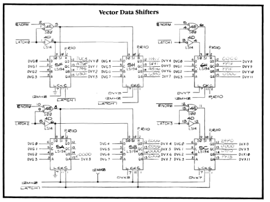 In the past I’ve had odd vector graphics issues caused by these hard to come by chips (LS385 and LS384)  on SW they are actually AM25LS15 and AM25LS14’s.  I probed these and they did not seem to be a contributing factor.  They can partially fail and not show up in the self diagnostics. After looking closer at the board…
