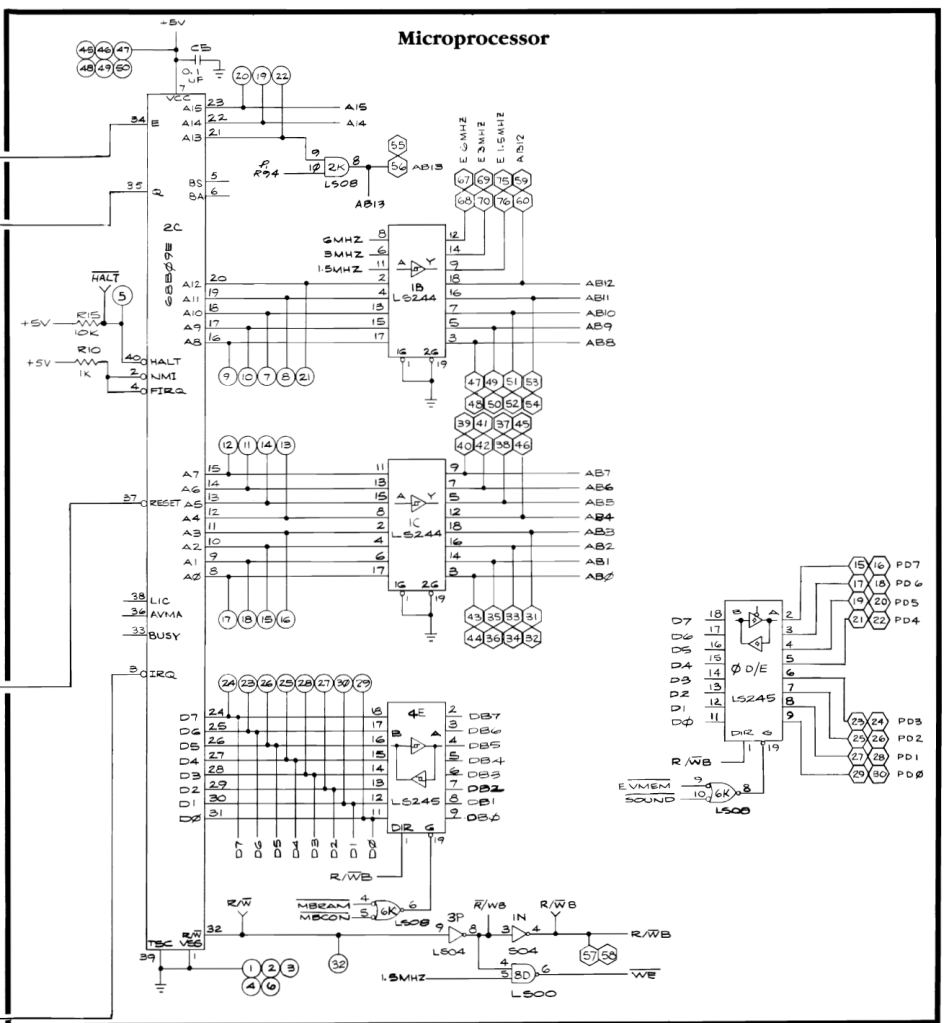 Directly connected to the CPU is A13 which goes into an AND gate@2K to create AB13. Clearly the LS08 is being used to drive AB13 so that it can be used on other boards in the stack. The CPU cannot drive it directly. Here A13 was running as expected. P-R94 was not.. This should be a simple 5v+ on a 1k pullup resistor supplying 5v or a ‘1’ to the gate. Using a probe w/5v+ forced the voltage onto LS08@2K pin 10 and made the board boot. Problem defined..