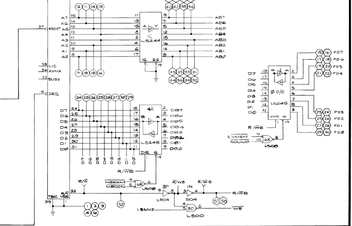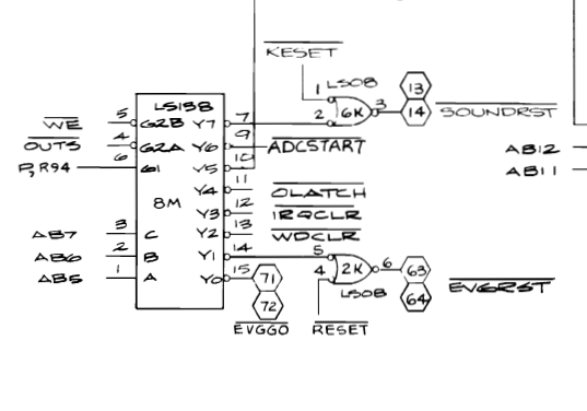 I then went through all the chips that I considered off brand/not TI and swapped them out and retested. I did this early in the circuit because it is clearly an issue with getting the vector code into the vector ram and executing it cleanly. After a few different chip families, I pulled a couple of 74LS32’s. They tested as 74HC32, but had been working fine (it seemed).. In the end, the LS32@2E – seen here is used in three places. It was the root cause of the graphics issue. I repopulated all the others one family at a time and no more glitches. If I were to guess, it was LS32@pin11. It clocks the LS74@2D Decoder Disable- signal ST3 goes directly in to the AVG chip and that is where the Easter egg gets selected for rendering. At least this is how I envision it..