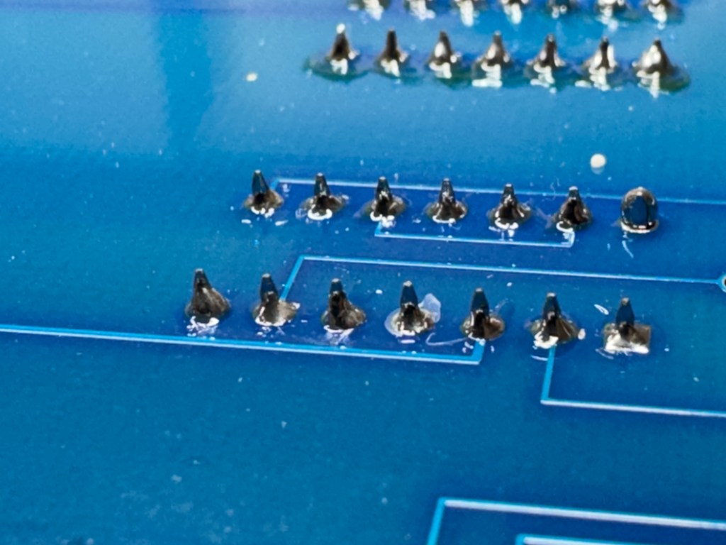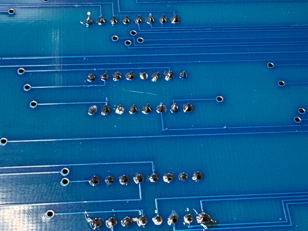 I’ve come up with a method I like to repair damaged traces on the parts side. Jumper wires on the back would be much faster – but subject to snagging and damage. Here are a number of the bad traces with Kynar wires bent down through the via’s and tacked to the topside trace with solder. It can take a few hours to work all through these. If you are not sure. Add a wire. If for some reason you need to remove the socket after the fact – there is a good chance you are doing the entire socket rewire again.. Once all the wires are in – I clean the flux with alcohol and use a clear UV curing resin to lock the wires in place. The heat of soldering in a socket will cause them to break loose without the resin to hold them.