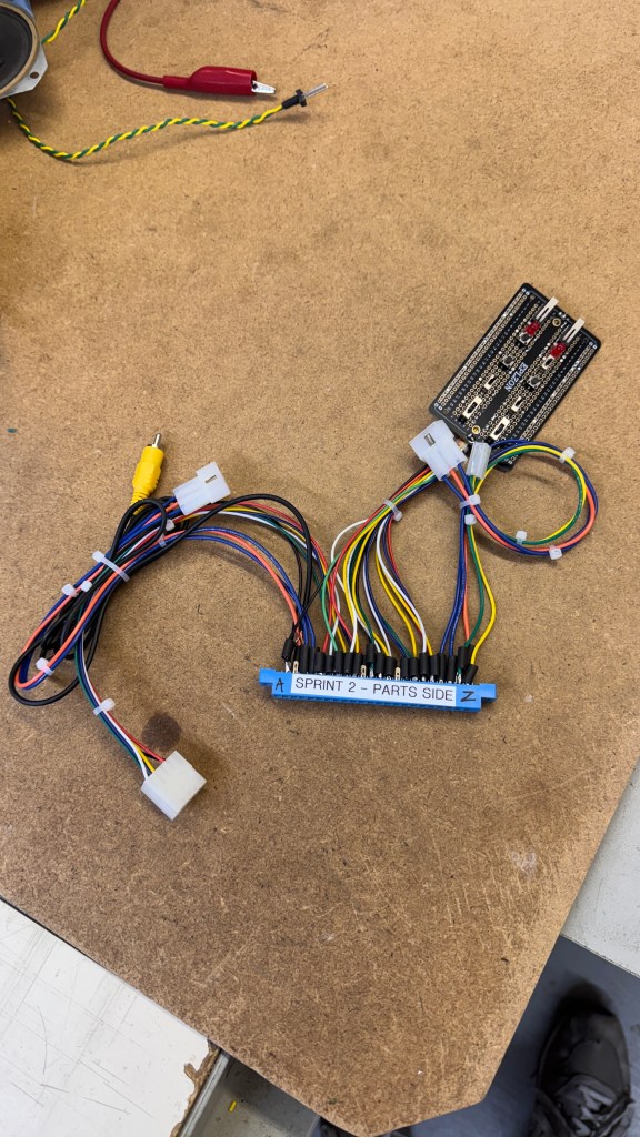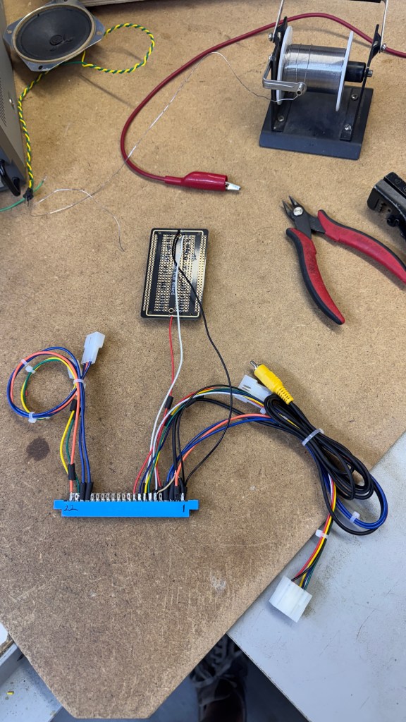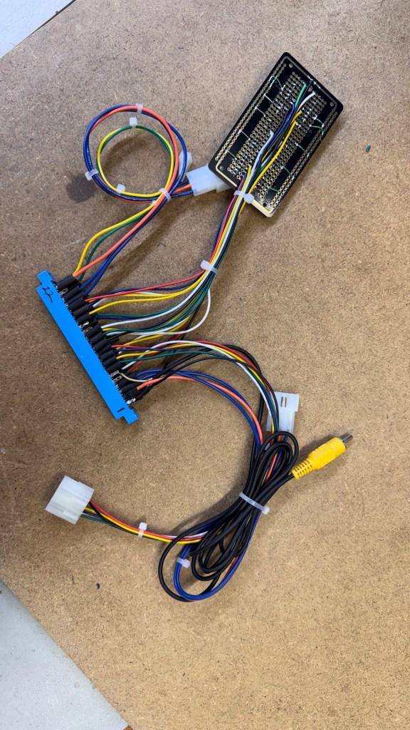It started real simple – 5v+ connected from a bench supply and a composite video cable. I’ll show the completed harness here, but this happened after getting the customer board working to the point where I needed ALL of the controls to continue testing..