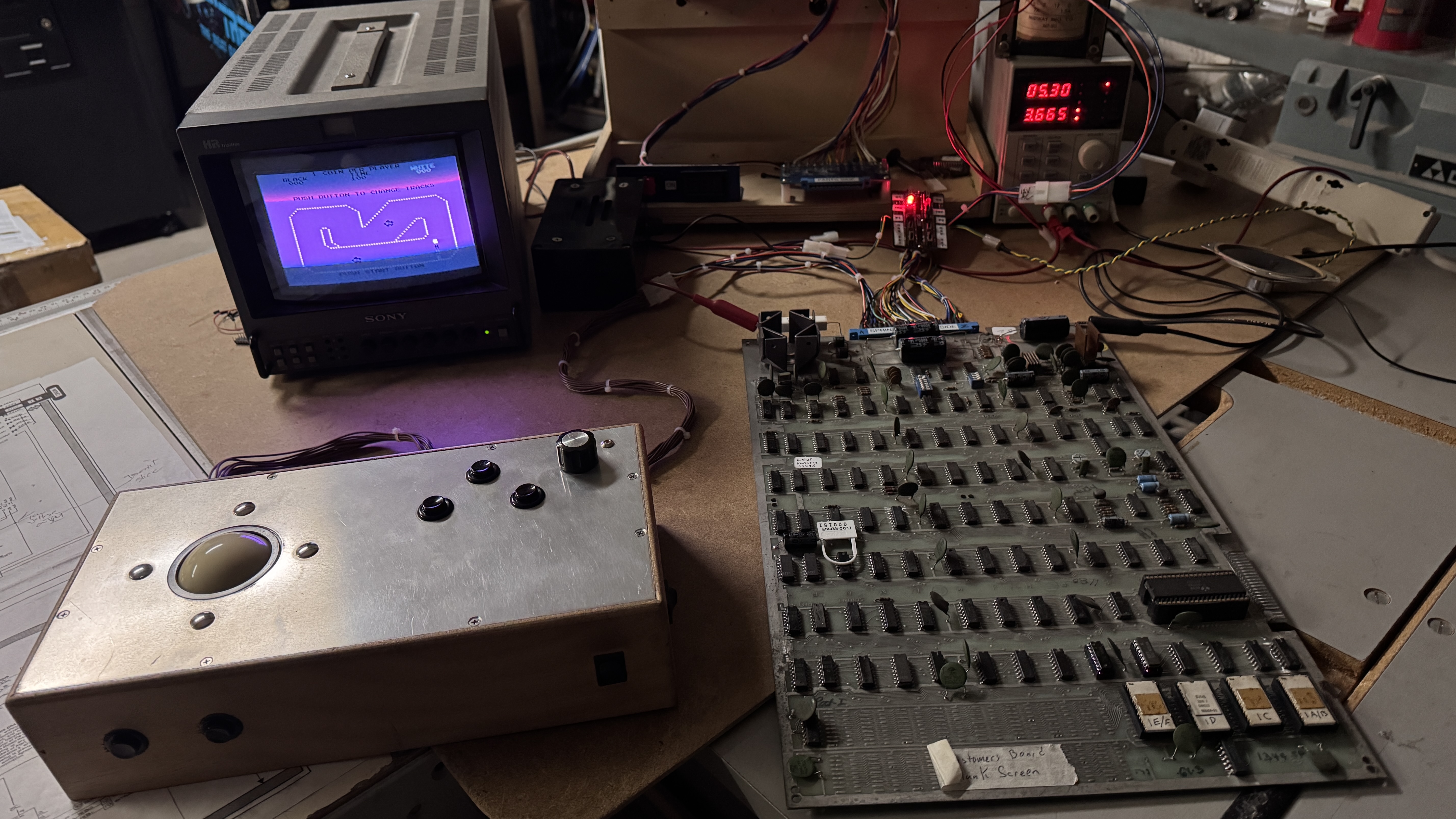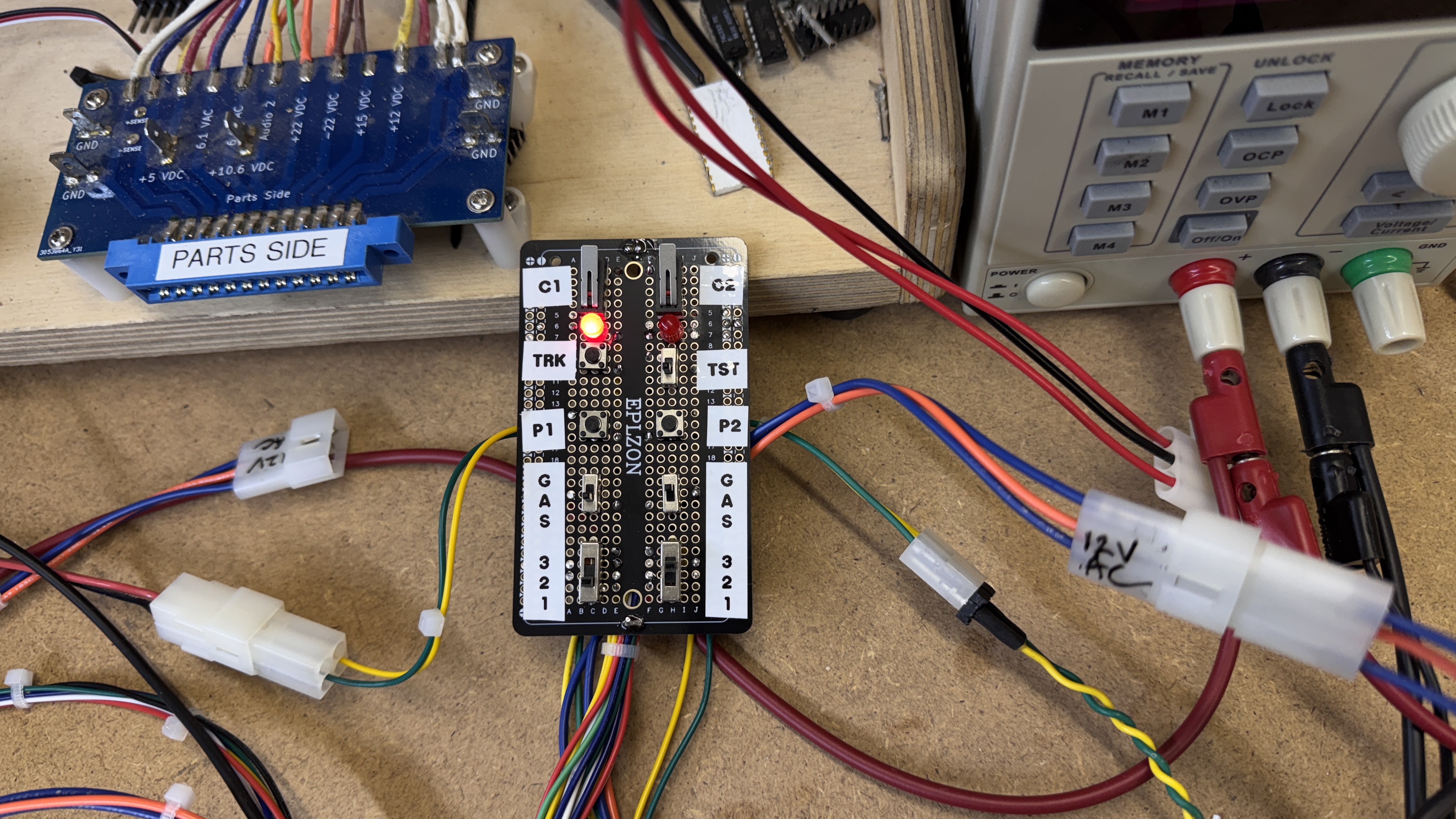 I’d added connections for center tapped transformers to make sure the on-board power regulation worked. The bench supply got used for the 5v+ in the beginning, but I’d found a situation where I wasn’t easily able to work around not supplying AC to the board. The AC setup works well enough and I had an old Pacman transformer that works great. My trackball is used for steering.. Horizontal for the white car and vertical for the black car. I can’t drive 2 cars at once anyway, I just need to know they work.. All of the other controls took a few hours to get wired up and debugged. Good thing Amazon exists.. I was able to get some switch assortments to make up all of the bits I need to test with..