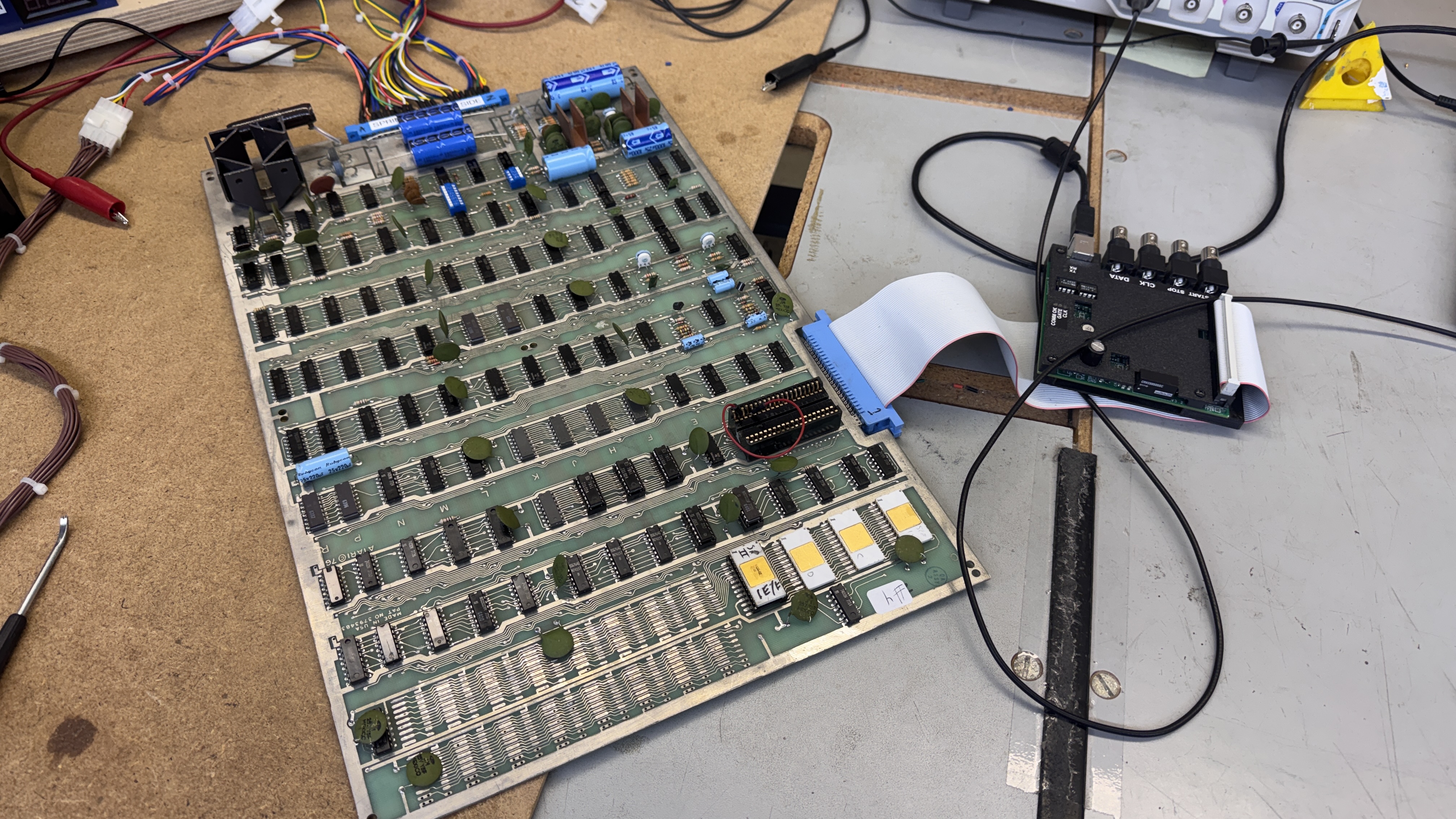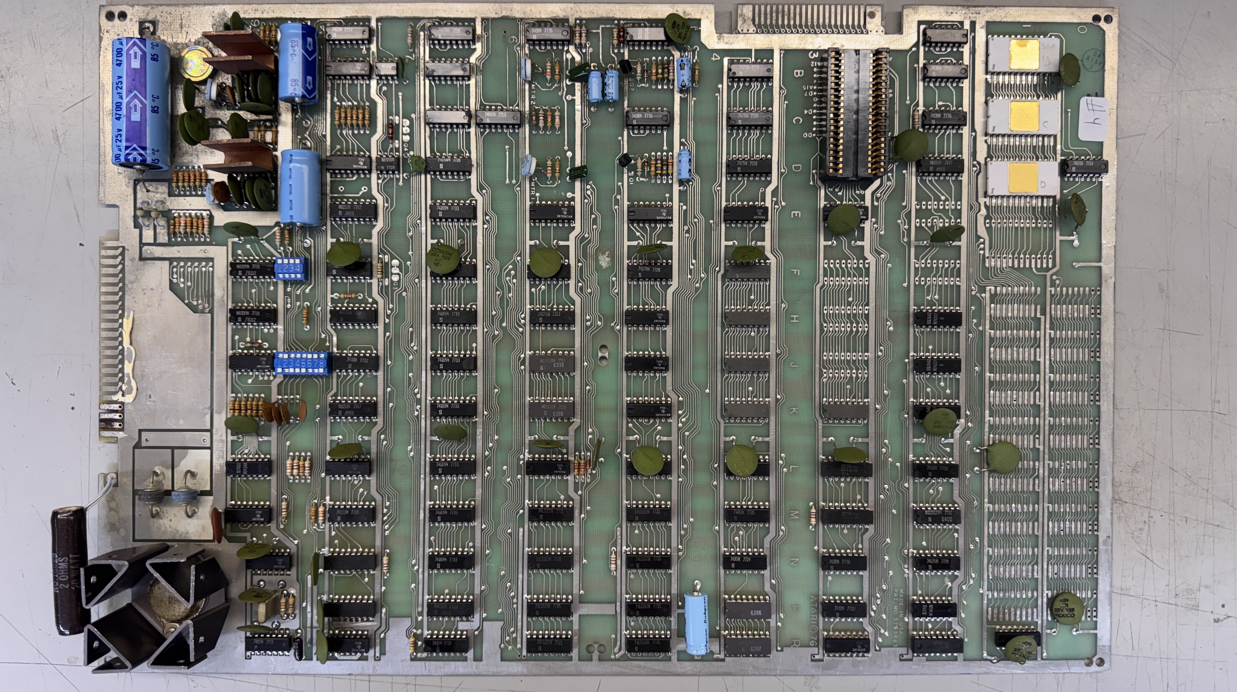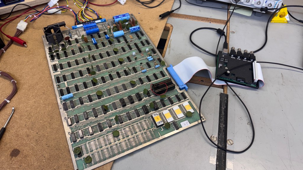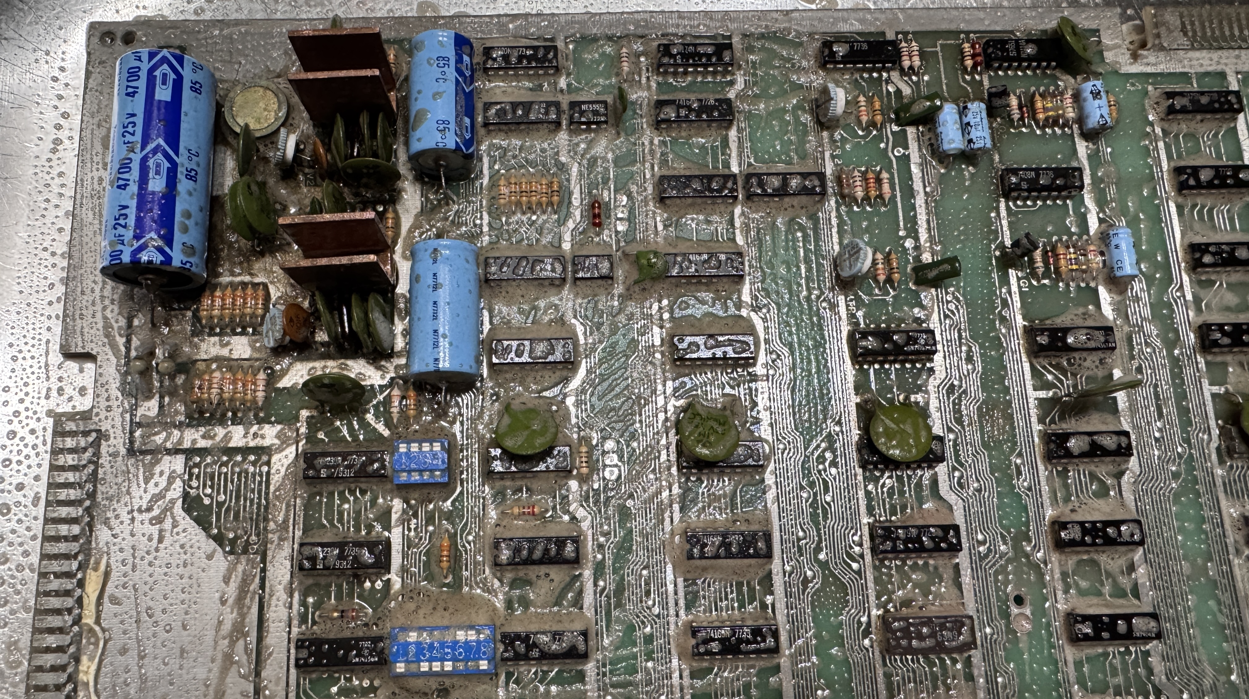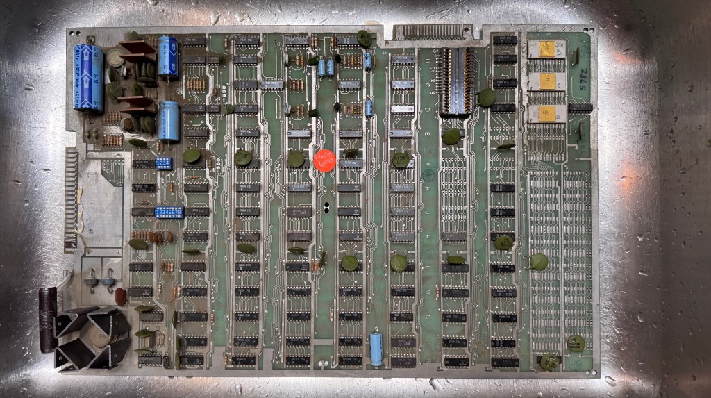 This board seemed to be under repair and was pretty nasty overall. At first I figured it would end up a parts board. While debugging the other boards I borrowed a ROM and the PROM@2E. ROM was good but the PROM on board 2 was bad.. This one was also missing the large filter caps, RAM had been removed and a 9301 had been removed. I wasn’t 100% sure it would be repairable/I’d have what it needed.. The first 3 boards were working at this point.