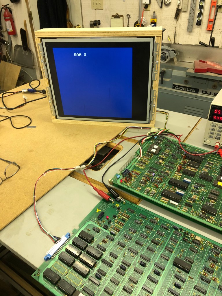 It’s all jury rigged together at this point, but RAM3 error – replaced ram @7H and cleared it! Video board was up and running with my CPU board. It’s obvious why there are 2 ARII’s in a Pole Position. The video board alone is pulling 4.5A.