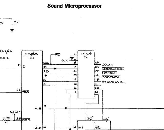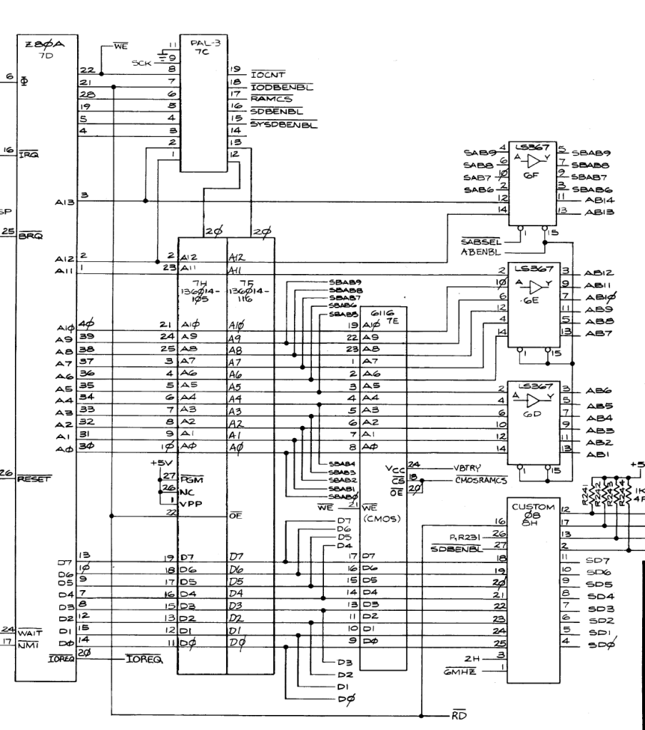 PAL-3@7C – Pin14 is undocumented on the schematics I was using. I followed it and it is actually CMOSRAMCS1 going into the RAM Battery backup circuit. The activity on the pin was similar (but not the same) as a good board. There seemed to be extra flashes of pulses on the scope, but the primary signal was good. I socketed and replaced the PAL, no change.