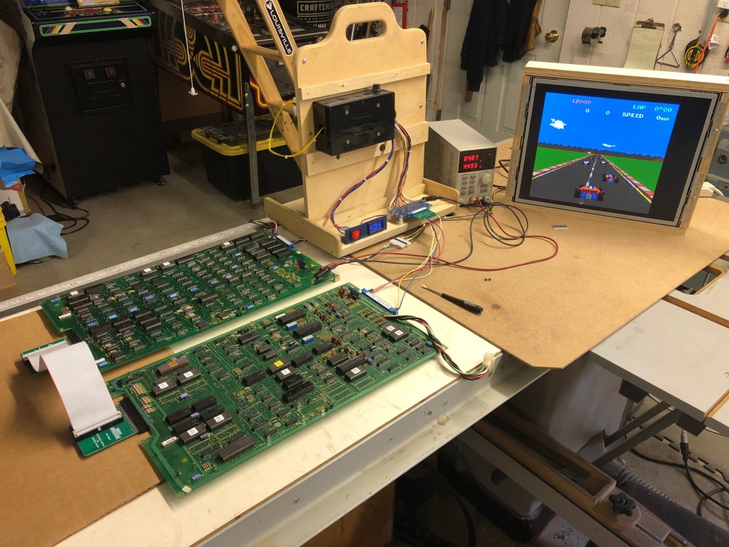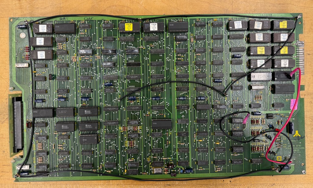 My plan had always been to work on Pole Position PCBs. I have 4 or 5 sets myself, I just never got to them. My test bench adapter was rather easy to assemble as compared to some other ones I’ve built. The video board is just 5V+ and the video signals. The CPU board is just 5V+. While getting set up for the very first time, I pulled out some of my boards and amazingly I got a fully working set. GREAT! Reference boards!