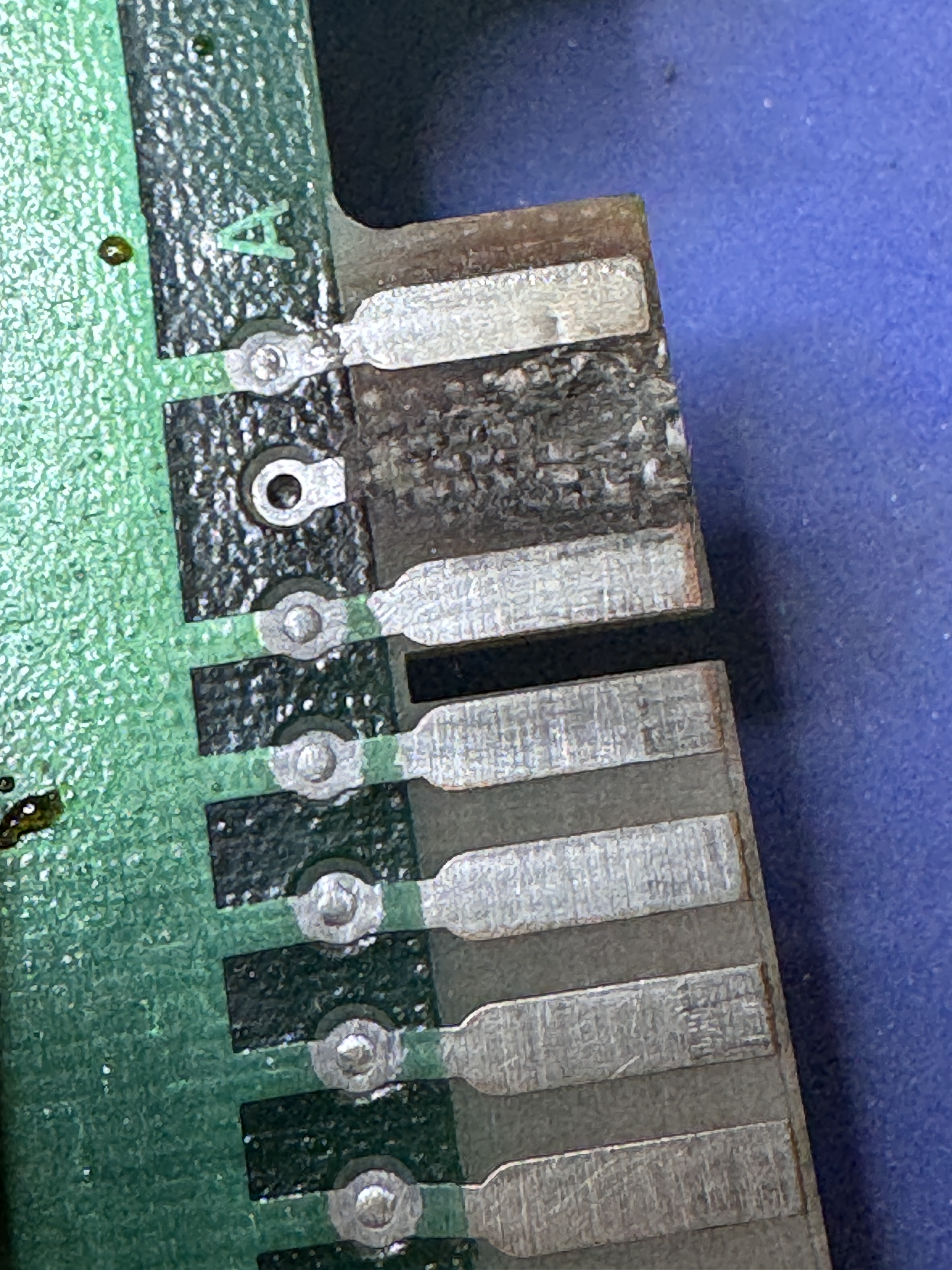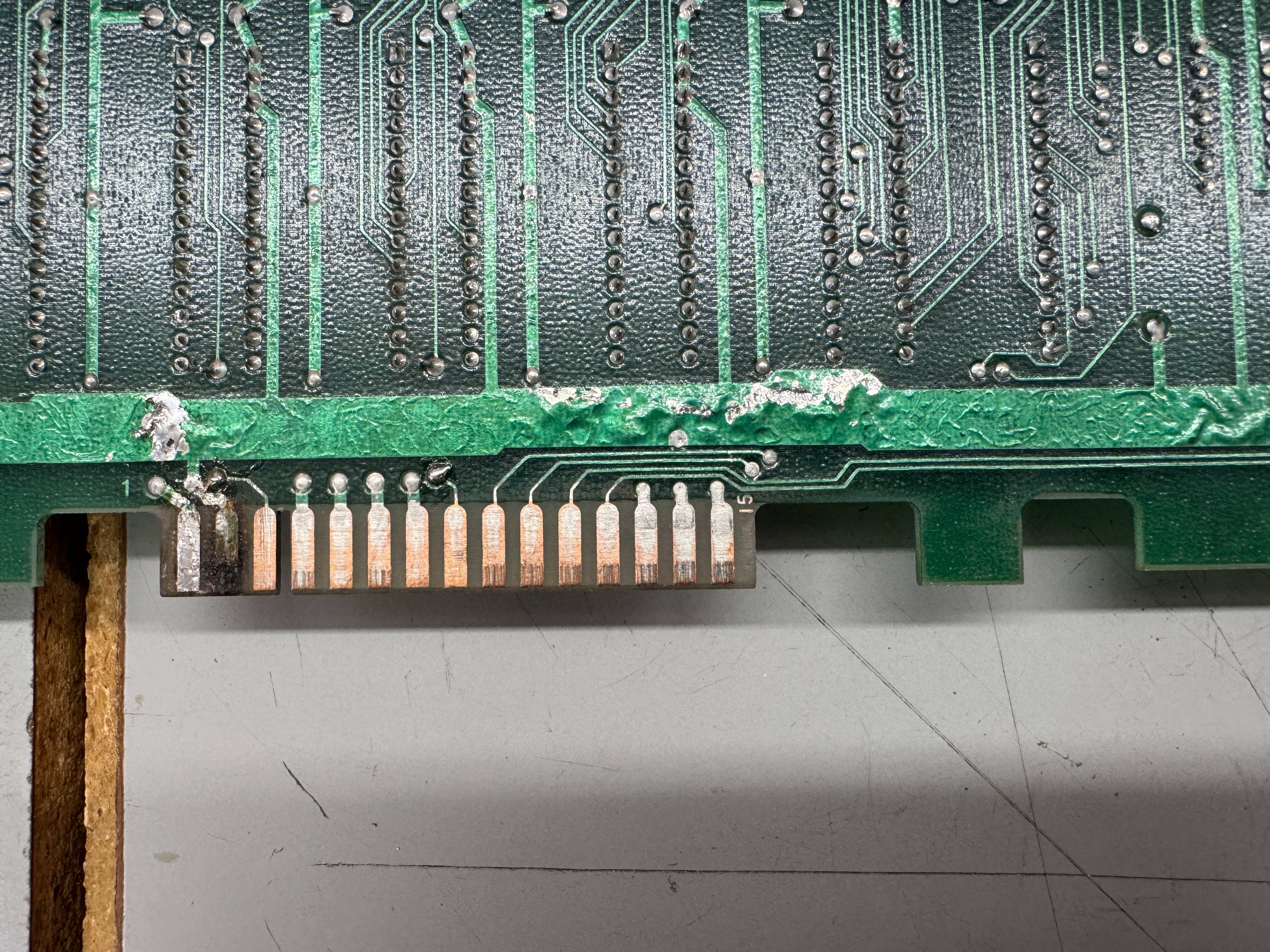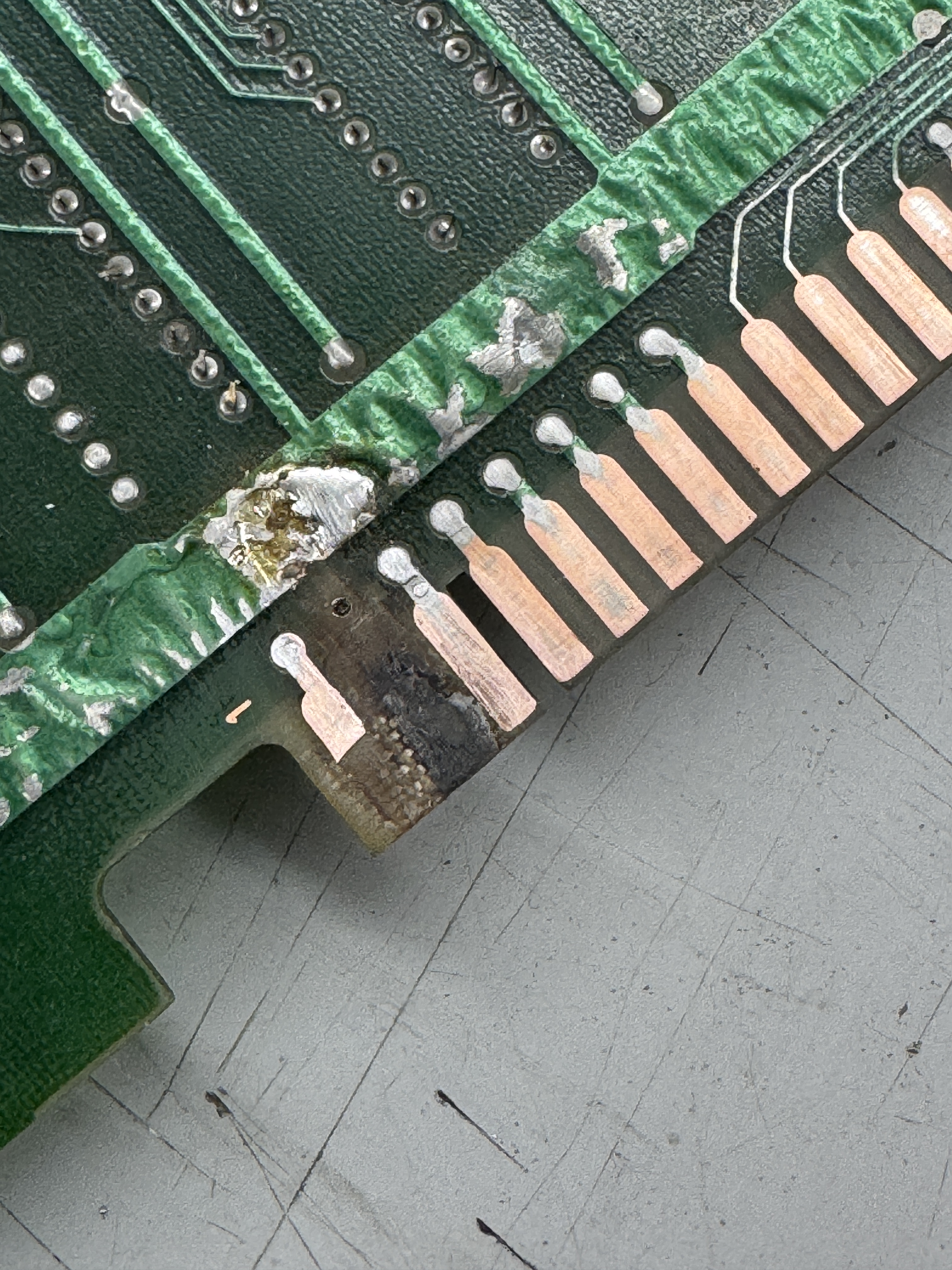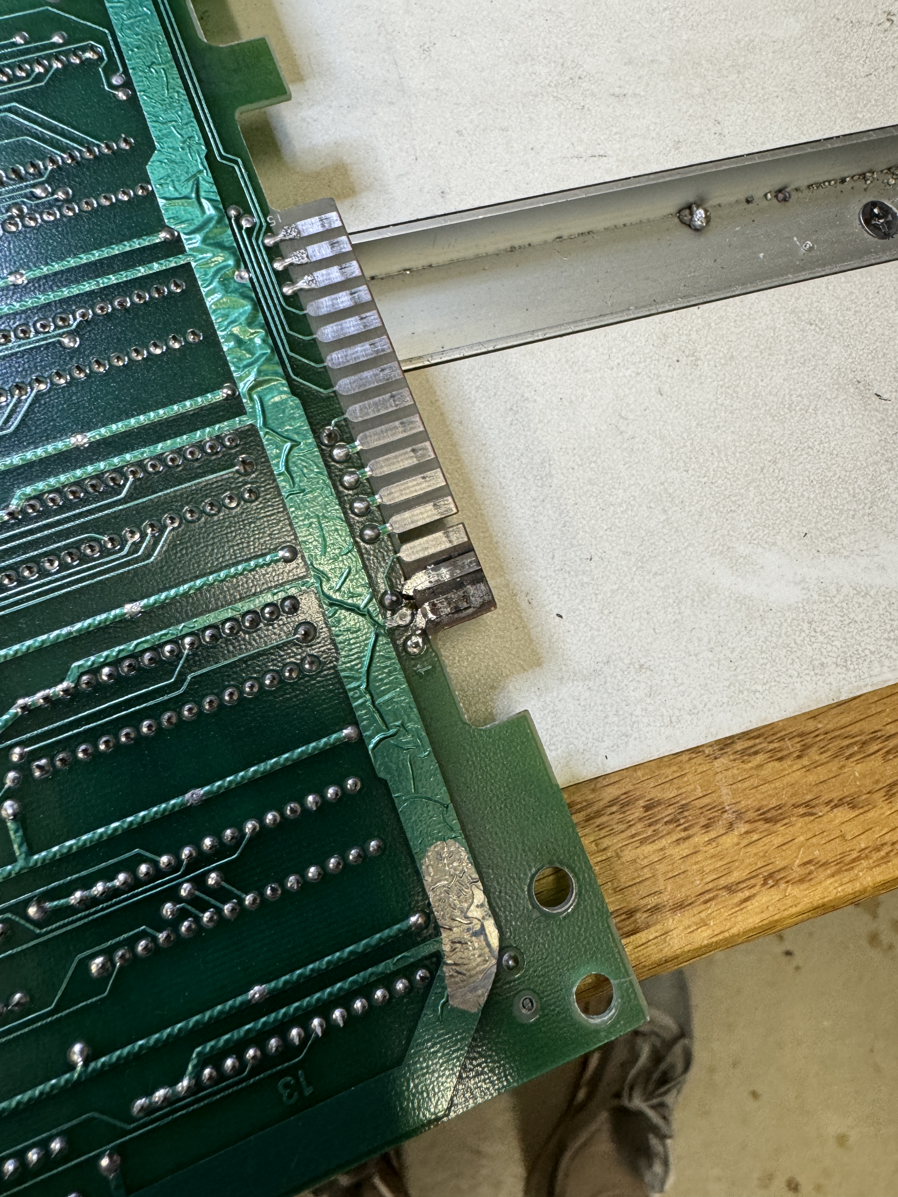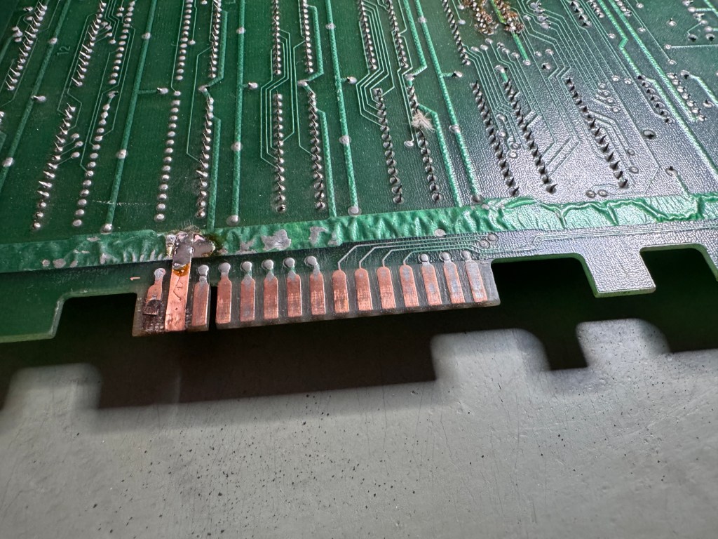 Lots of careful work replacing the copper. The material I use is just slightly wider that the original fingers. It needs to be trimmed for proper spacing between the pads. If it’s too narrow – the edge connector can straddle two connections and burn something up. Final step is some liquid tin to coat the exposed copper and reduce the chance for oxidation.