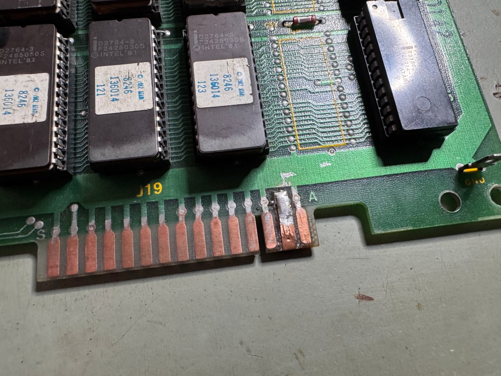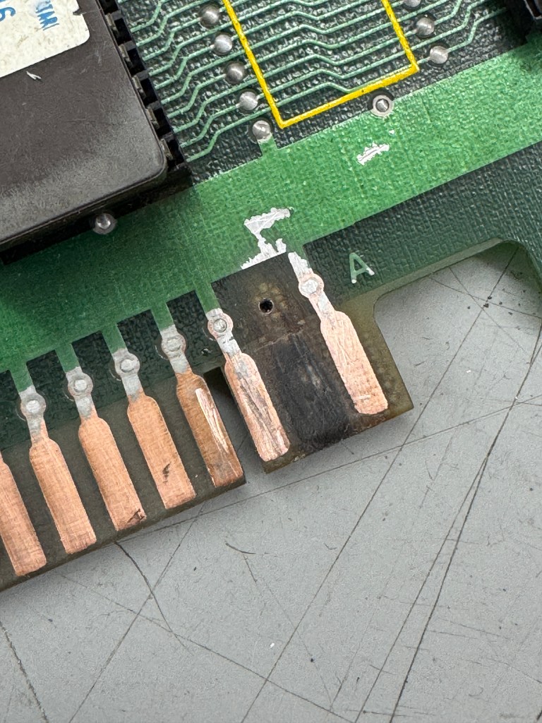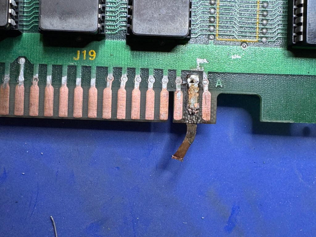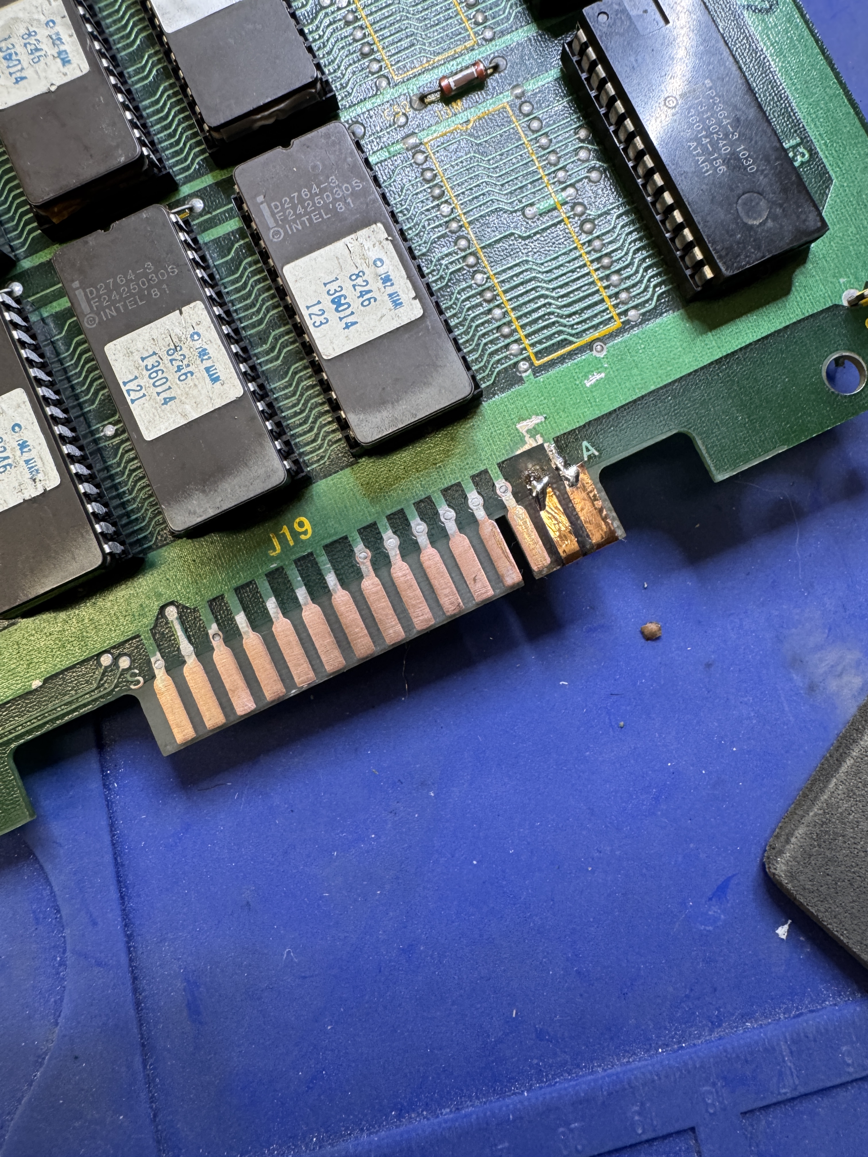 On to the CPU board. I wanted to clean up the edge connector repairs.. I’m sure they worked, but they were extra thick. After removing the bad ones..