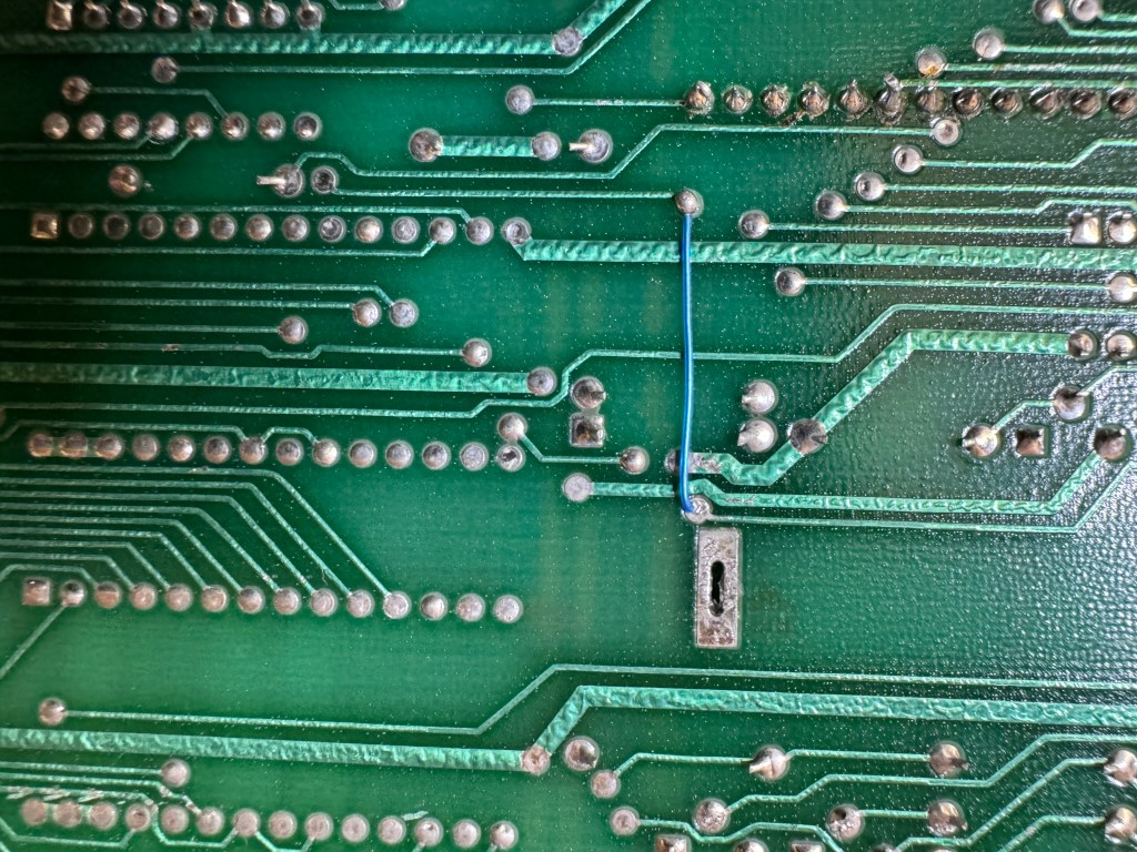 Not as bad as a couple of my other boards. But needed to be addressed. I used etching acid to help with the alkaline damage front and back. There were also solder side jumpers which I removed as part of the repair (not a fan and I remove them whenever possible)