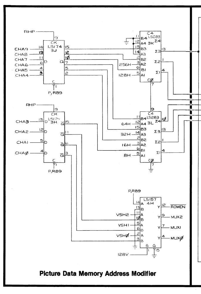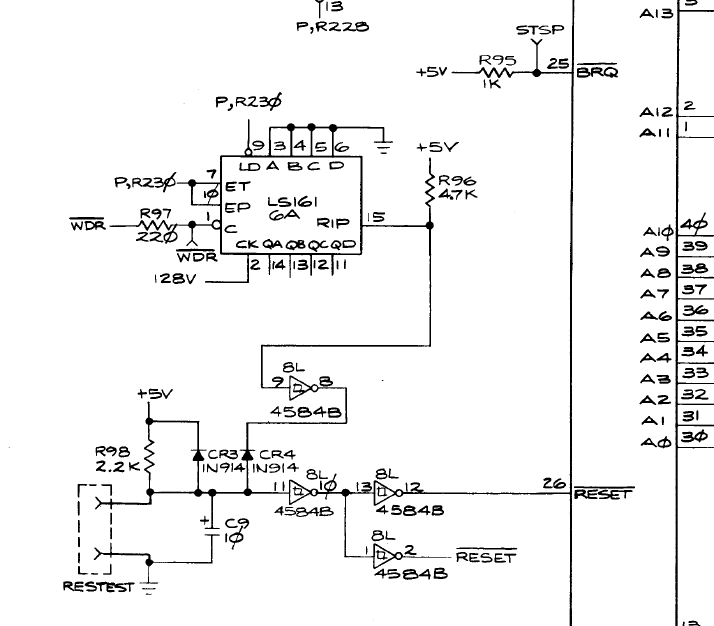 Connected up to the CATBOX and all the video RAM tested bad.. Replaced the WDF test point which was missing so I could disable the watchdog. After a lot of poking around since this was my first PP repair – I determined the RAM was never getting write enabled. Backtracked through the circuit and found this area: