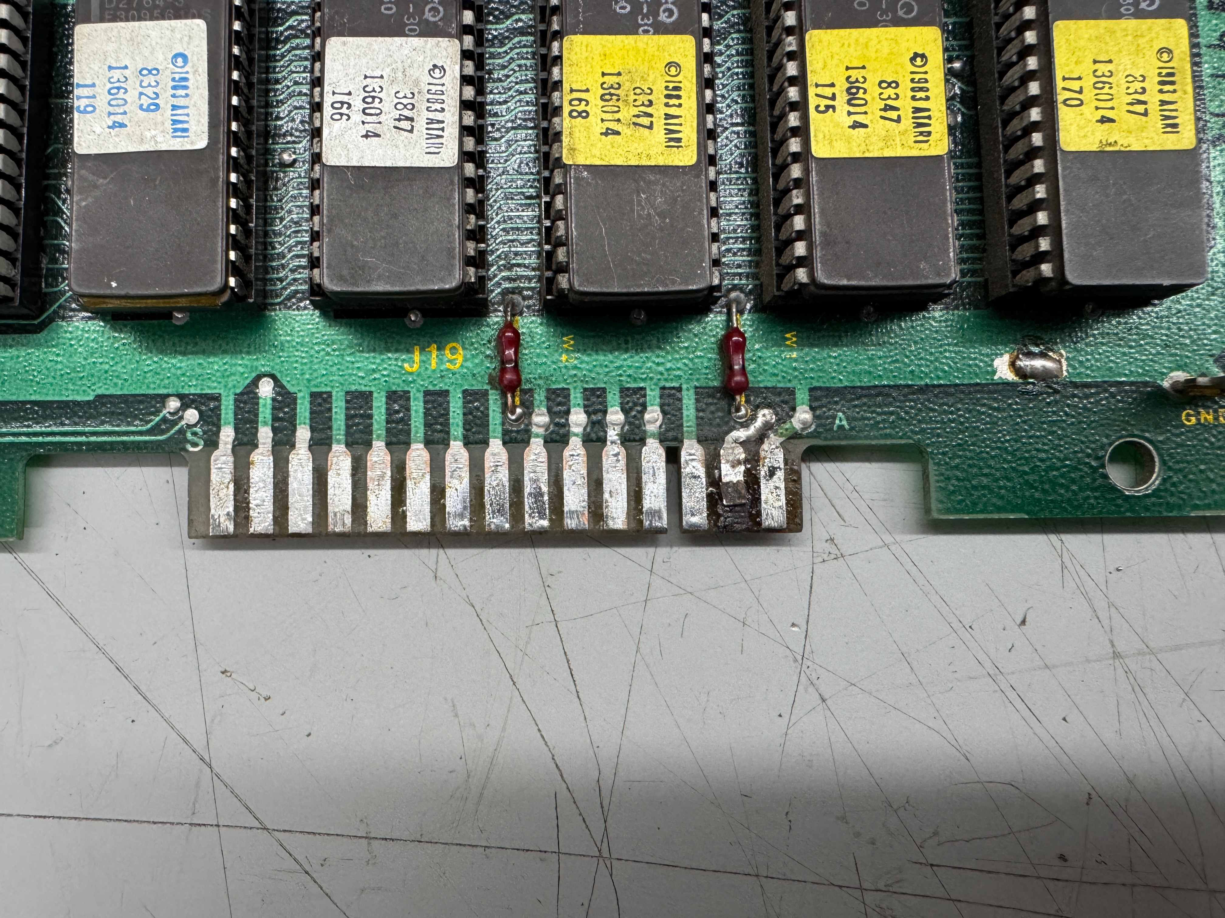 Customer said the board worked – but he did not want all of this wiring and wanted the edge connectors fixed properly. He sent both ARII’s for testing and refurb with this set. He also said the battery backup didn’t work. The CPU edge repairs were pretty good, the video board edge repairs were not. The wiring all over the PCBs is useless.