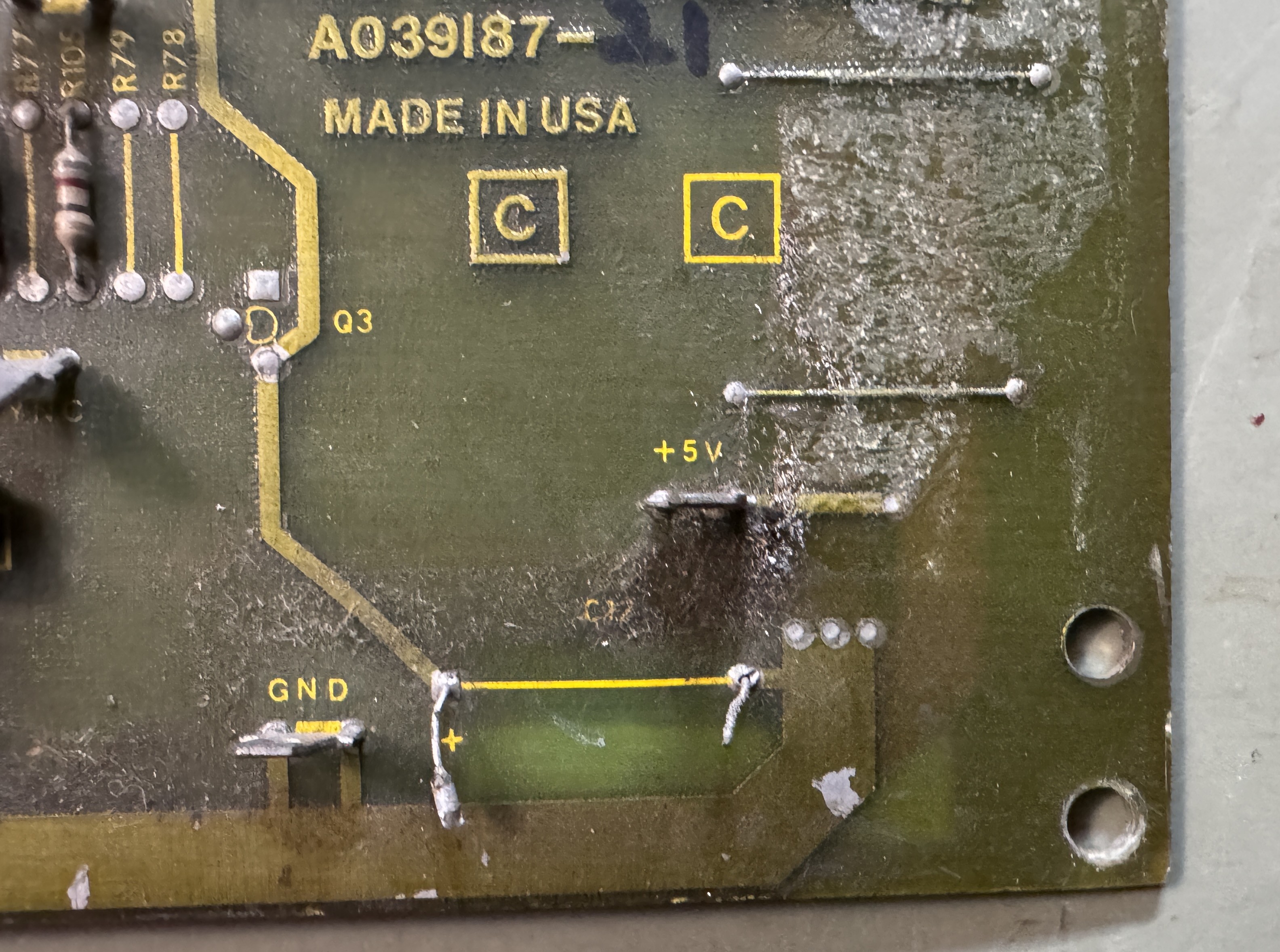 Q3 was showing an emitter-collector short. I pulled it out and the short was still there (20 ohms). I traced it back to this guy (C67) who must have been in the process of failing. It wasn’t in the alkaline damage.. Replaced C67.