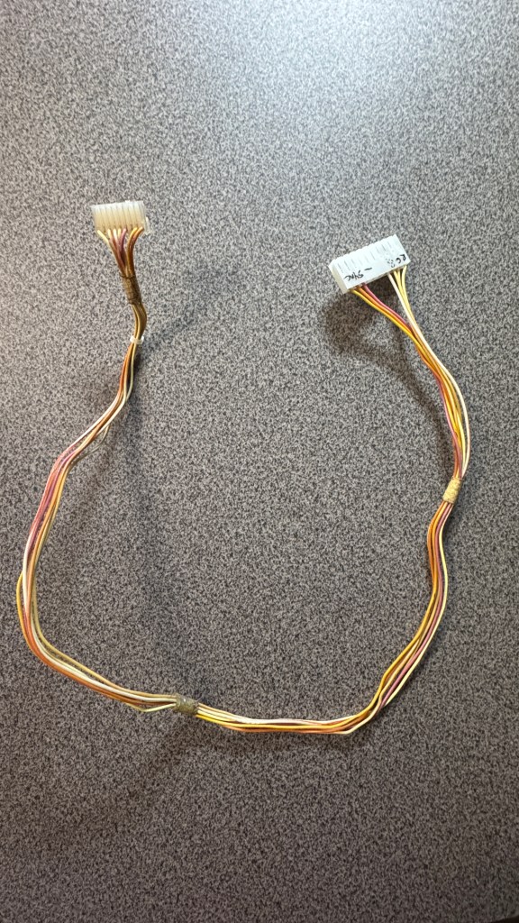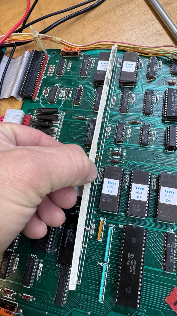 This white paper covered component is a bus bar shown here on the CPU board. On the video board they are missing and someone put caps on some of the spots where they had been. Not having a lot a ton of MCR specific experience – I didn’t realize there significance at first. The CPU board bus bars were all but broken off. Once testing, video was a mess if the board decided to boot at all.. It was showing major issues.. Probing around found a bunch of floating voltages. I’d expected to find more written on bus bars than I did.. long story short.. there are two busses on the single bar, 5v and ground. They are separated by paper and the bar is then covered in paper.. Not sure why they chose this route. The board seems to have plenty of room to route GND and 5v connections directly on the PCB, but I didn’t have to design it 🙂