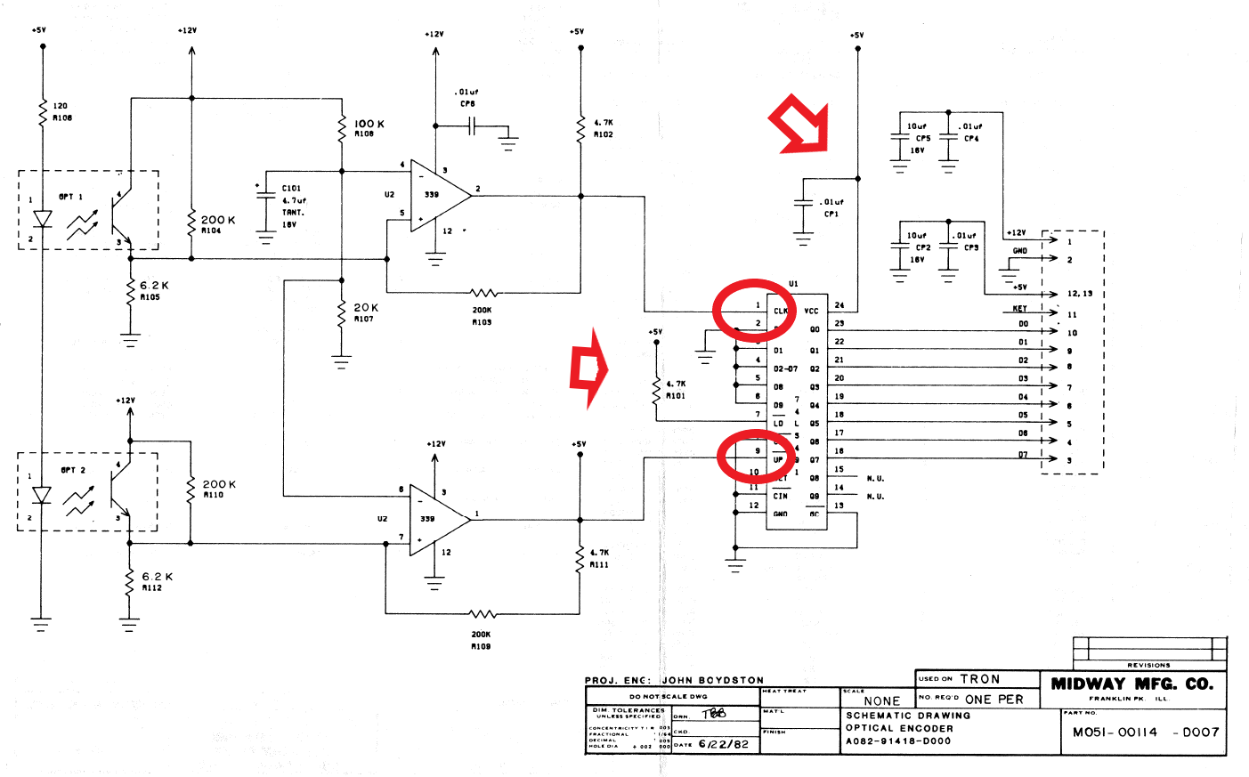 Here is the schematic for the Bally Optical encoder for the spinner.. The optics go through a LM339, get adjusted to 5v, etc.. But eventually just enter the 74LS491 encoder as clock and direction.. Just like any other optical signal. I picked up a 74LS491 (not common) breadboarded the chip to a connector, added the R101 pullup resistor and cp1 cap to the 5v line..