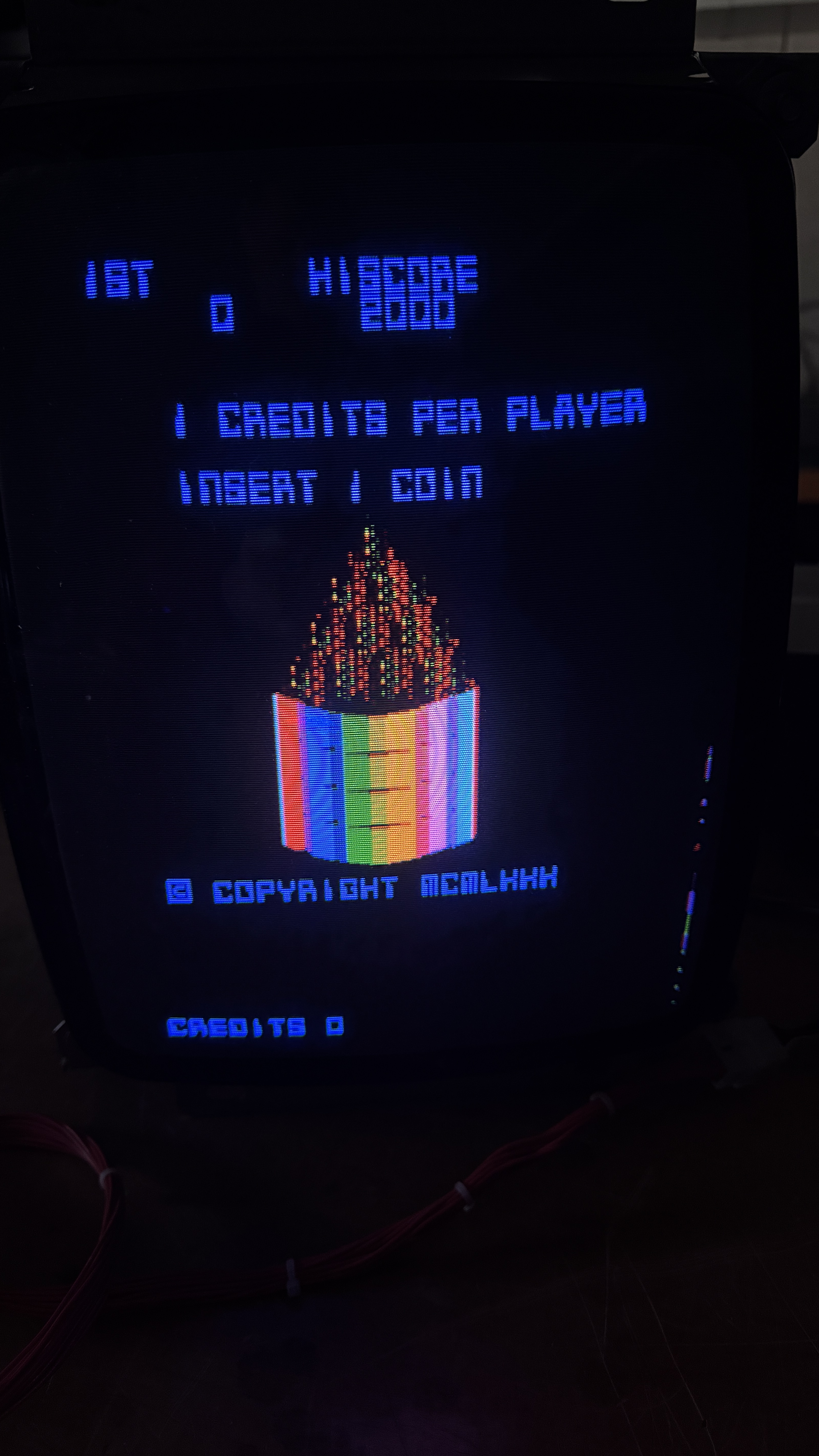 Lines across the color bars on this screen and the tank motion object would break apart at times. MCR boards have a feature that I love.. The FREEZE dip switch.. I’ve used this on other games (Star Wars, DigDug, etc..) when available.. Freeze allows you to stop the game in its tracks during an issue and you can look for the failing component. This particular issue took a while to hunt down.