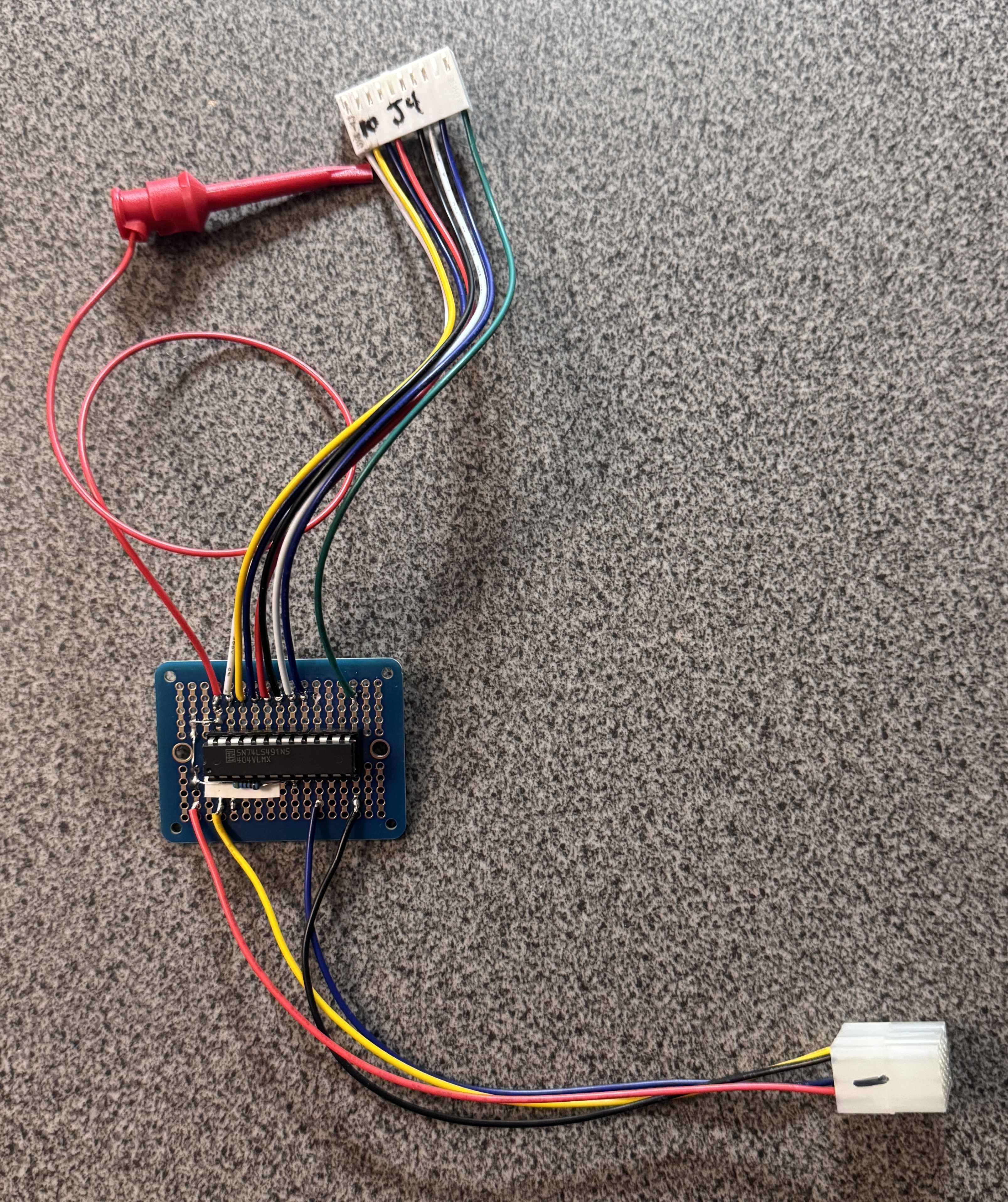 The result was this adapter that supplies the data bits to the MCR board. There wasn’t 5v easily available on the MCR edge connector where these bits were… But a filter cap is right there on the PCB to attach the mini grabber. My bench trackball can easily supply the signals for the MCR spinner now. It isn’t perfect or precise – but the spinner spins.