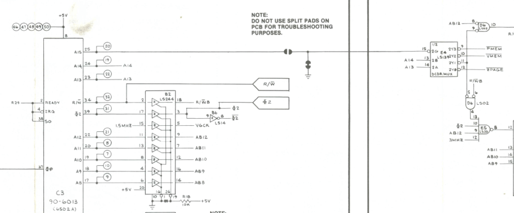 Tracing backwards, /VMEM comes out of the 74LS139@E4. This had been socketed and replaced at some point. The chip was a Texas Instruments (good) – but the socket was junky. I replaced it. No difference..