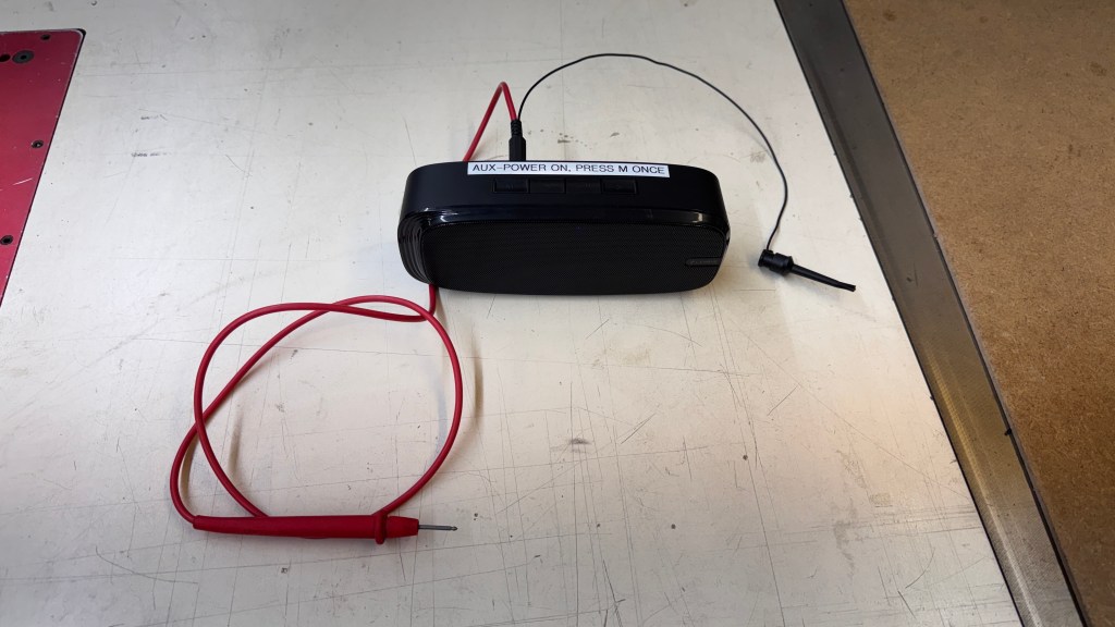 I picked this speaker because it was inexpensive with an audio jack and was rechargeable. It is really nice considering the low cost. The only trick is when you power it on – it is ready for Bluetooth. Press the power button once more and it switches it to the AUX input. I labeled it because it won’t get used often.