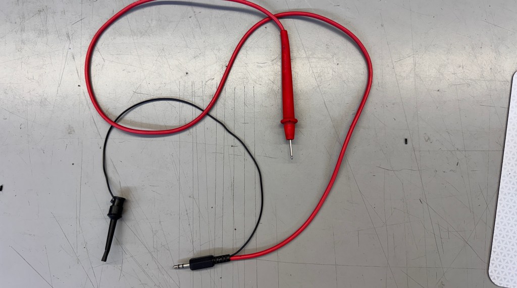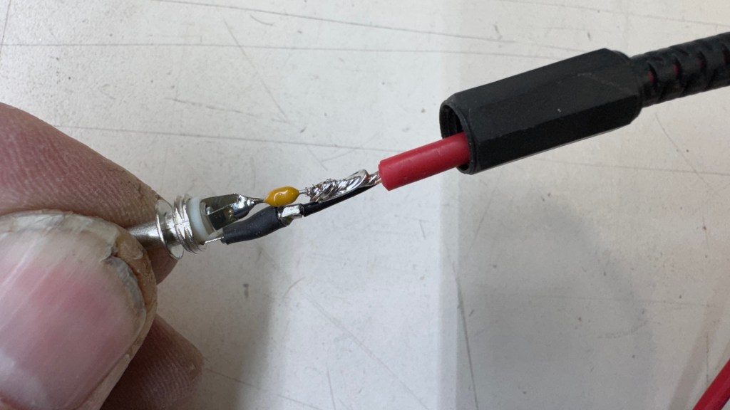 This all worked nice as it turns out.. I soldered, crimped and used some heatshrink tubing on the ground wire – which I made too short – I will make it at least 24″ long. For the probe to work – you need a .1uf capacitor. I looped one end of the lead through the left and right channel loops on the headphone jack and soldered it.. On the probe side, I looped and soldered to the wire.