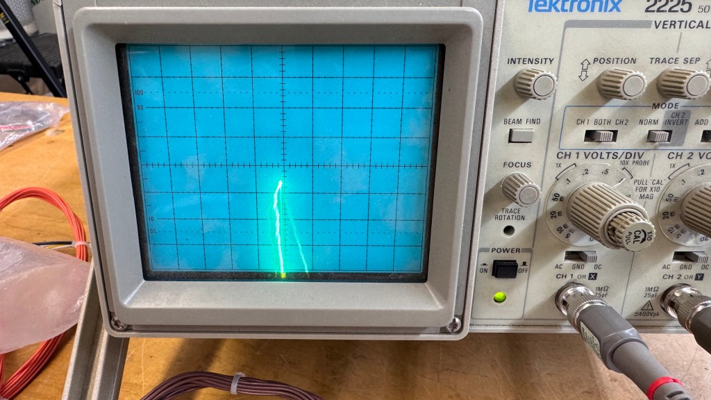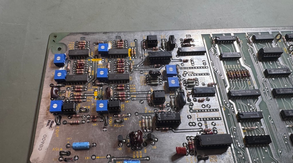 Testing showed corrupted output on the Y side of the analog section. The test pattern would show, but way off the screen.. Popping a few chips out and socketing didn’t resolve the issue as it usually does. Finally I found this testing the input to the DACs