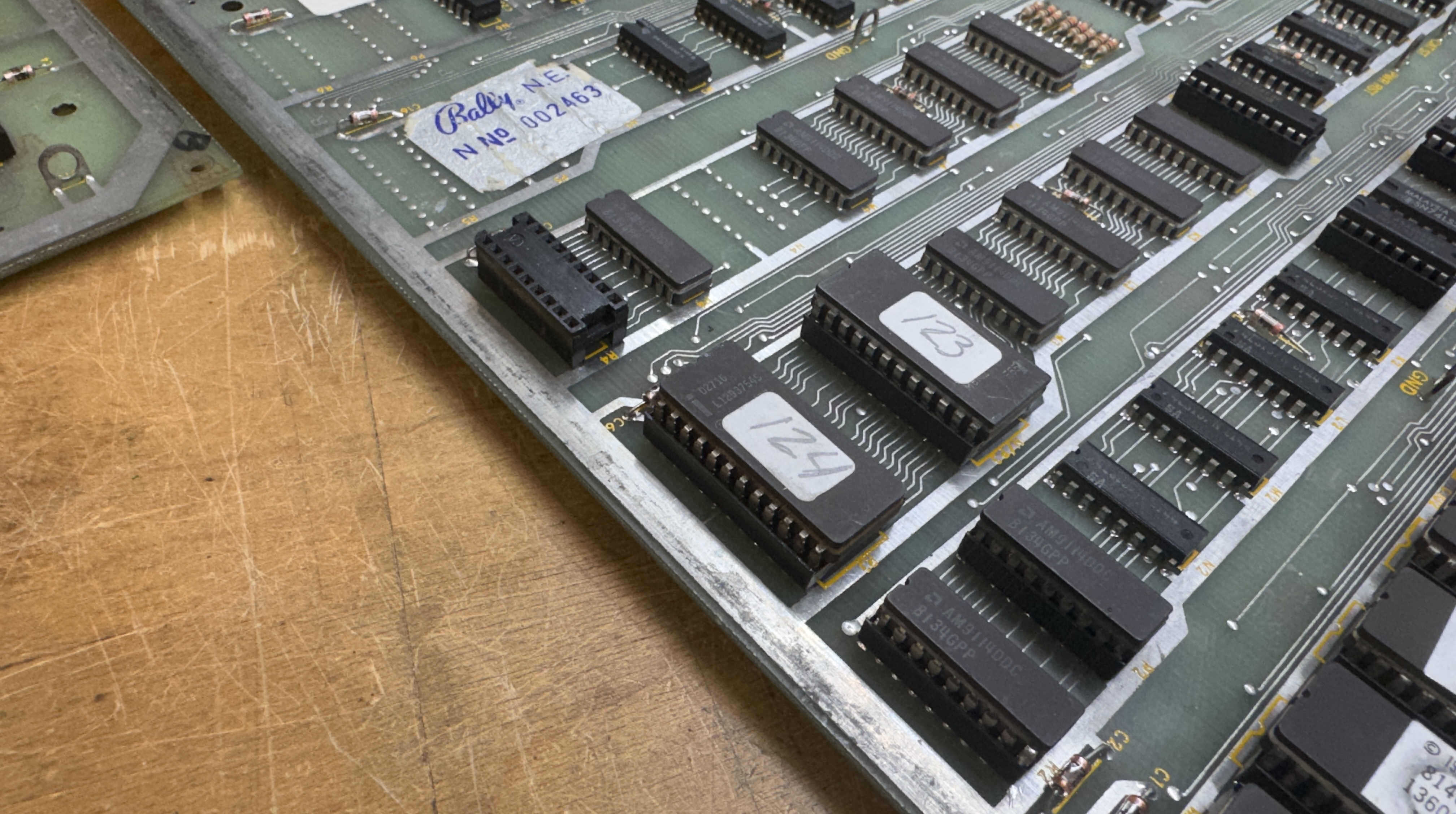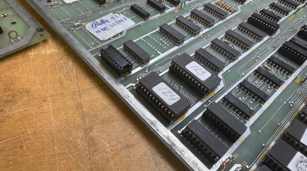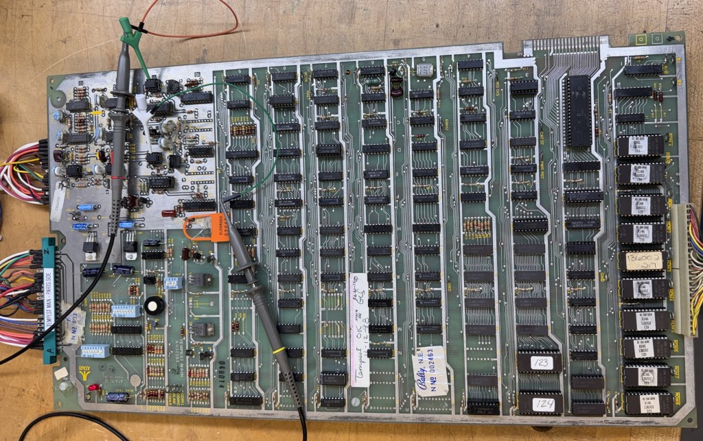 This one has made it’s way around with a number of repair stickers on it.. Board looked good (ROM 121@P1 was in backwards). The socket replacement looked good on the surface – very clean work.