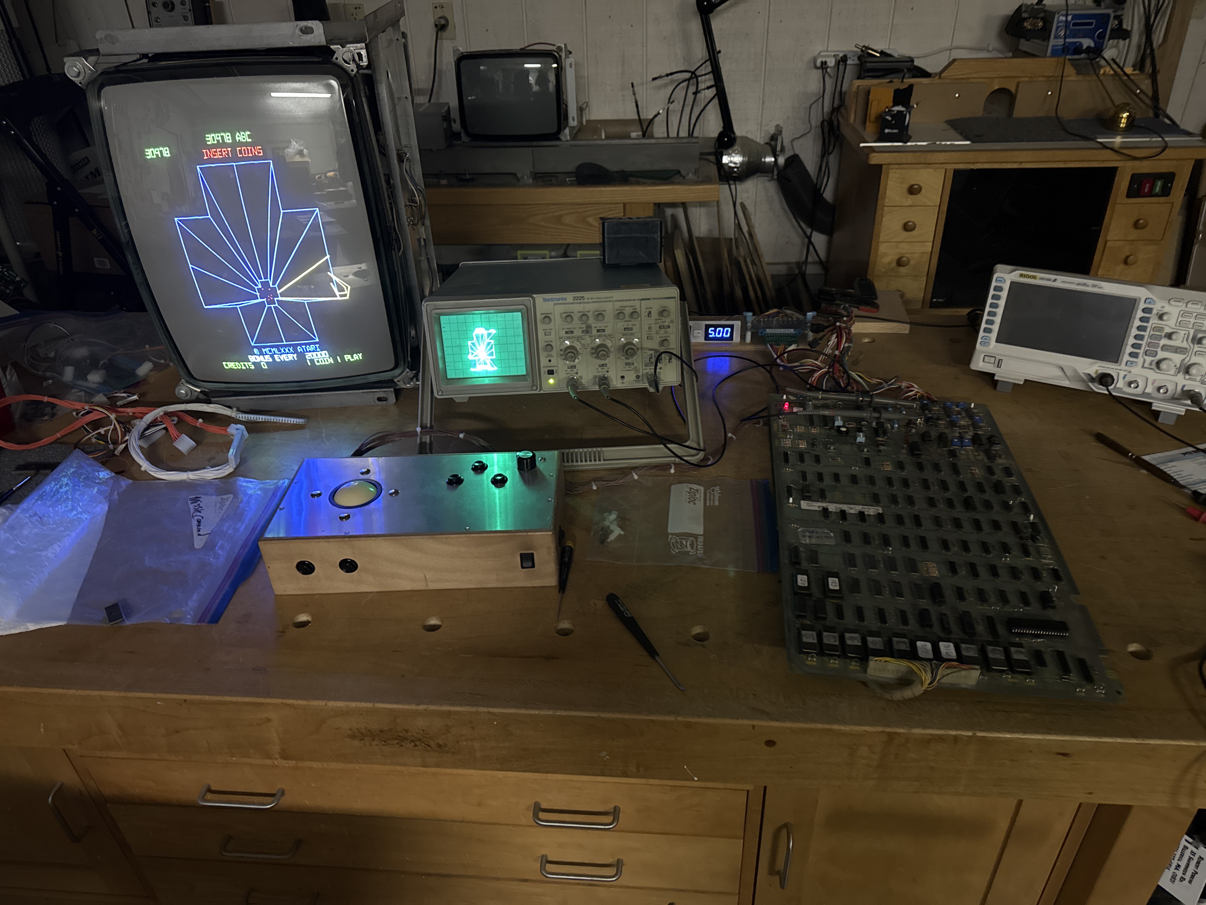 When I picked up my Tempest cabinet – I was fortunate that it came with two sets of boards. Both in unknown working condition. At some point I picked up third set to work on and later a fourth. At the top here are some of the very first PCBs I ever repaired.. My full test bench evolved as I decided repair work was something I really enjoyed.