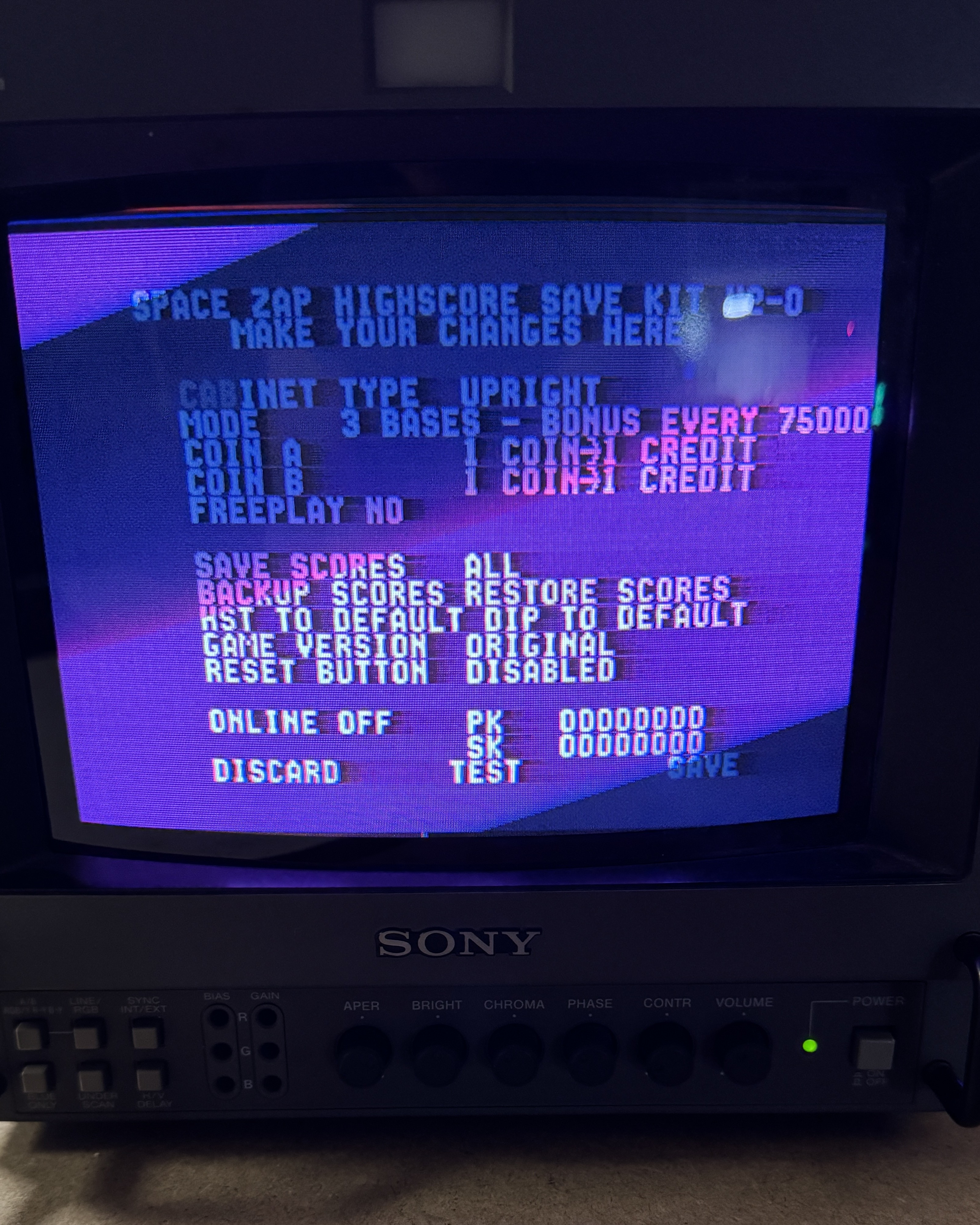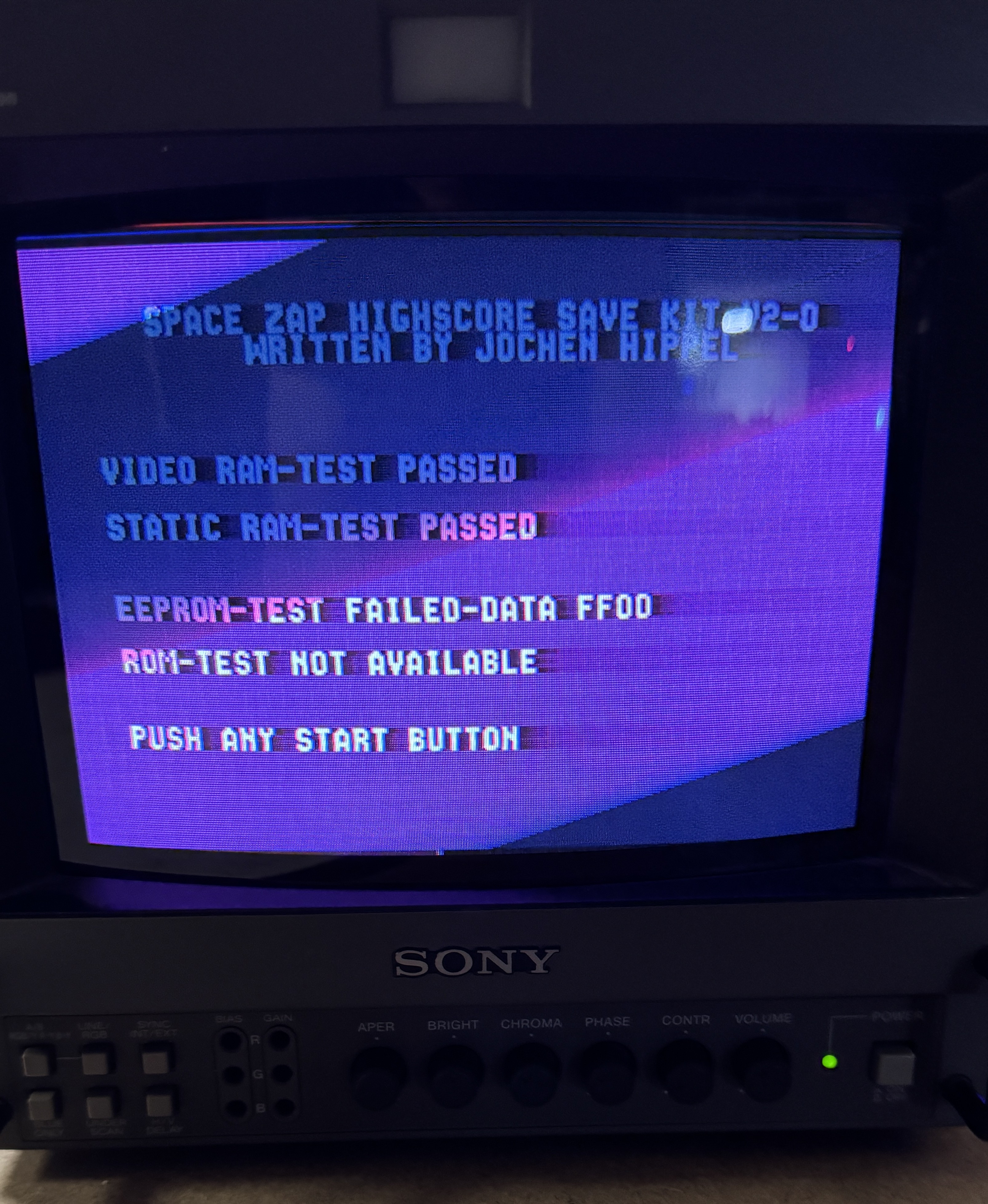 Here you can step through the freeplay setup and run tests. It says EEPROM tests fail – not sure what it is testing.. My high score has been on there for a week. I’d didn’t have a bad pattern board.. But it tests it..