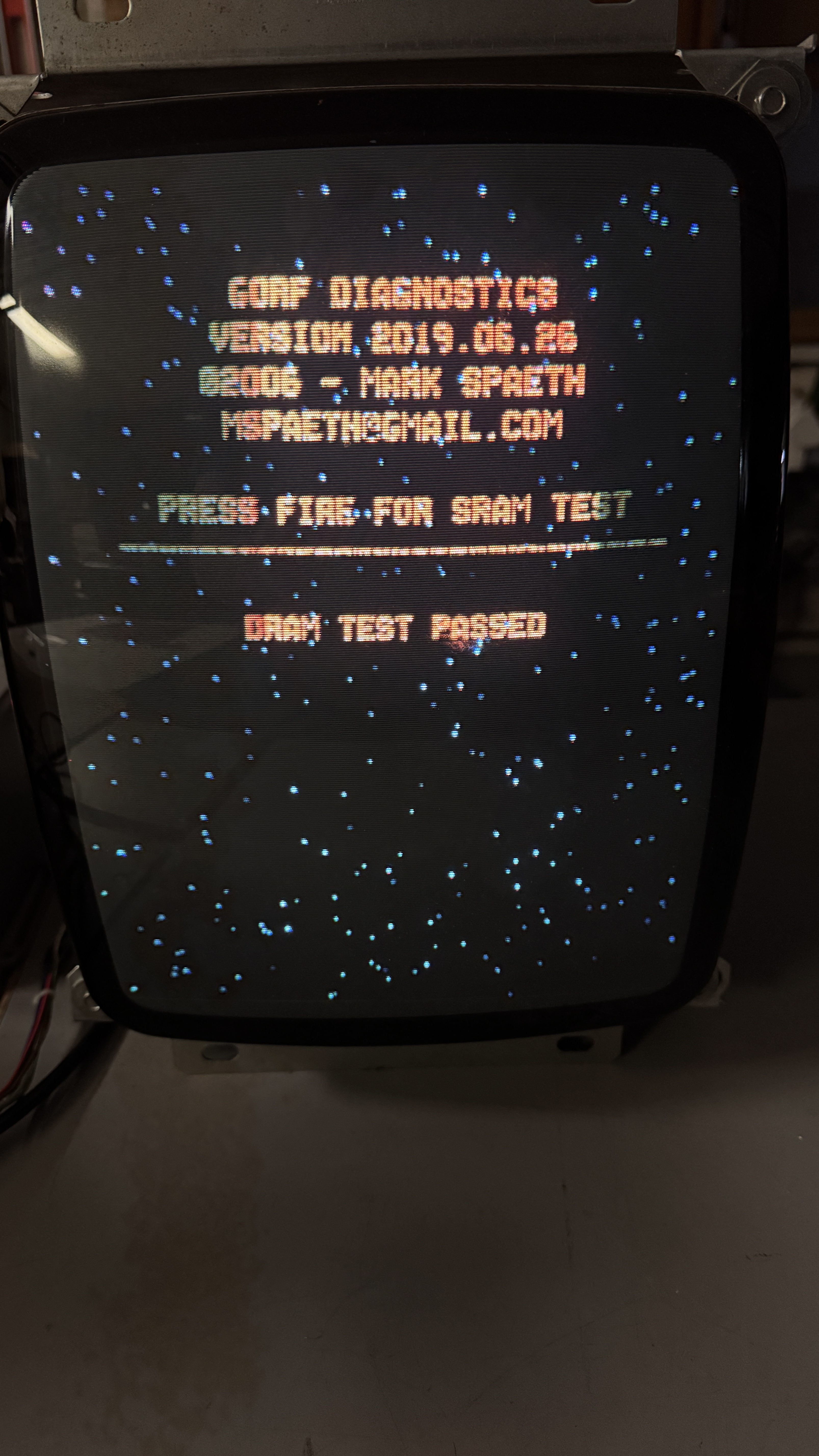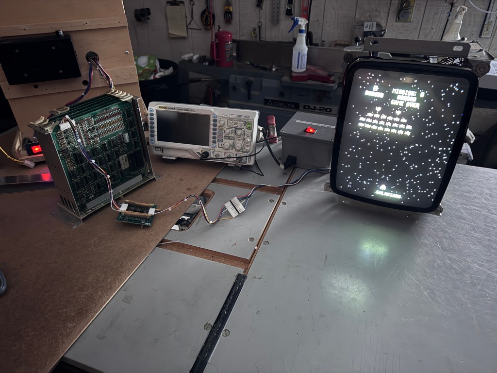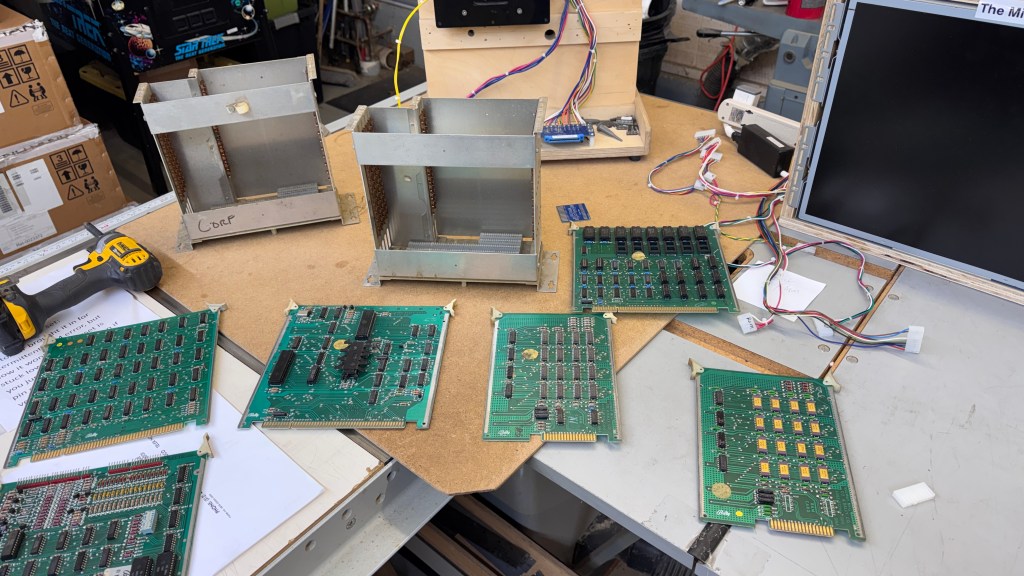 At this point I had 3 sets of Gorf boards.. All as standalone sets that had issues and did not work. I shuffled around boards in set #2 and #3 (same owner) and got set #2 working – it took a bit between testing the bench setup and finding a good combination of boards. Of course the boards with issues ended up in set #3. Having a working set (shown with just video connections above) allowed me to get all of the other connectors assembled and tested. Putting together the bench adapters usually includes a little debugging. Mine started with a rolling screen (Negative sync..) and then a mis-pinning of a control direction. Both audio channels plugged into the ARII and worked. As long as I can hear things.. it’s good!