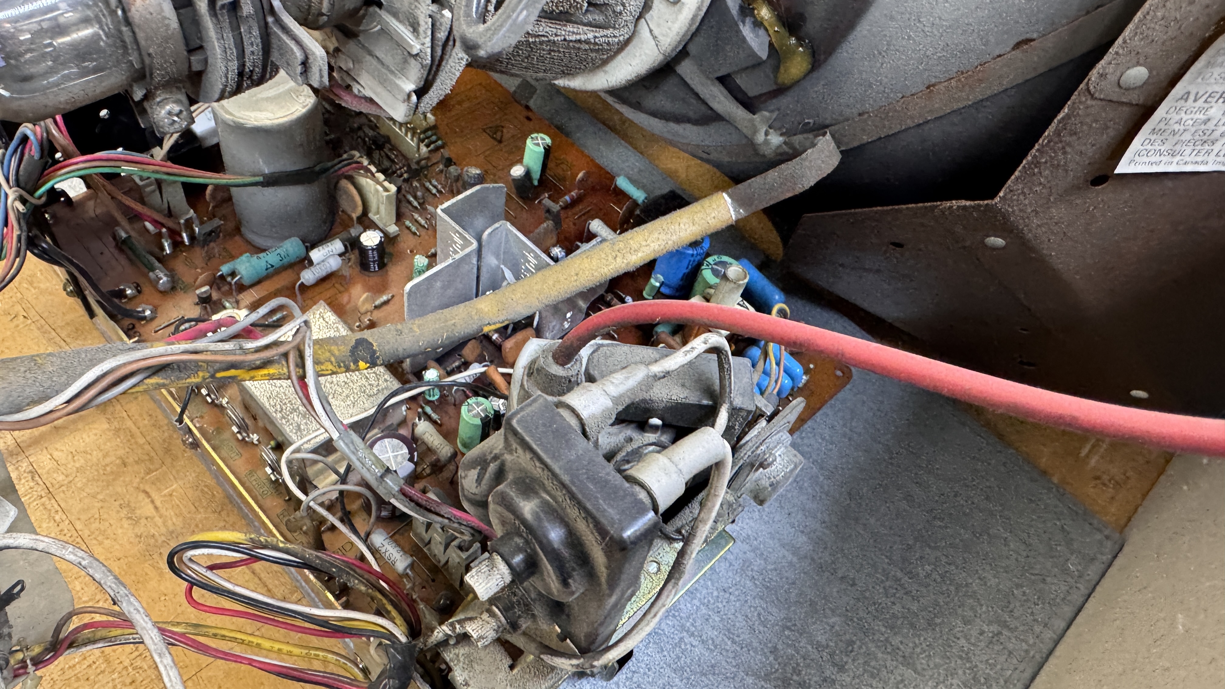 It was even dirtier than it looked. On occasion I will test caps coming off of a chassis just to see if any were bad. All were within spec as it turns out. I didn’t expect caps to fix the collapse. I tested all of the transistors, diodes and power resistors looking for the cause of the collapse. Nothing jumped out. Powered it all back up and it was still collapsed – but no smoke. So that was good. Put it all away for the night.. Woke up with.. “test the yoke..” in my head.