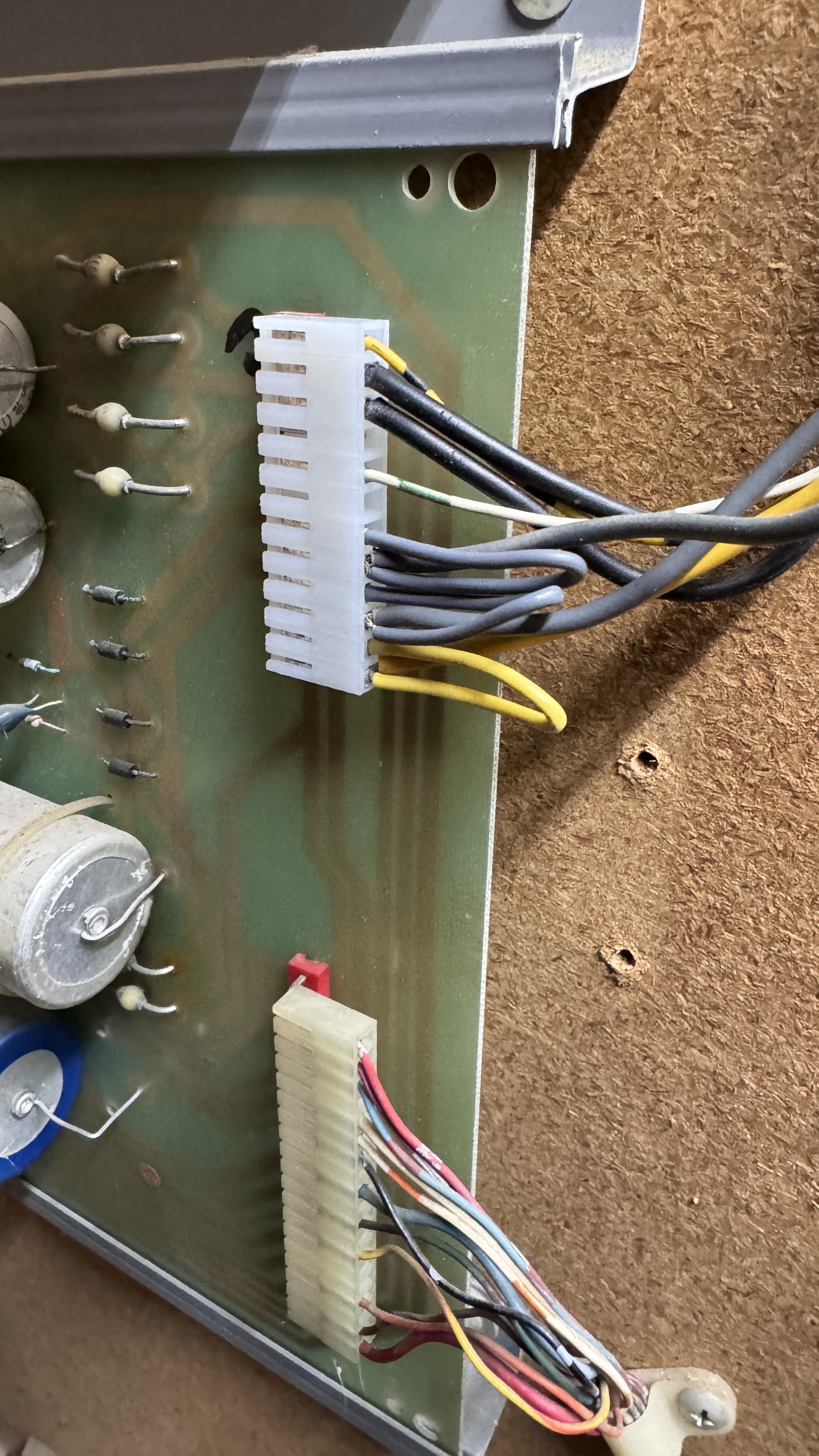 The header pins were pretty cruddy – but they polished up nicely. I wired a new Molex connector and looped the AC so that it would hit both input pins for each line coming from the transformer. Everything else on the power supply checked out. I did test all of the AC voltages – the transformer was pretty dirty. All of the fuses got pulled, checked and cleaned up too. I worked my way around all of the connectors and checked/cleaned. Powering up just the power supply board – no issues. All voltages were coming out of the board correctly.