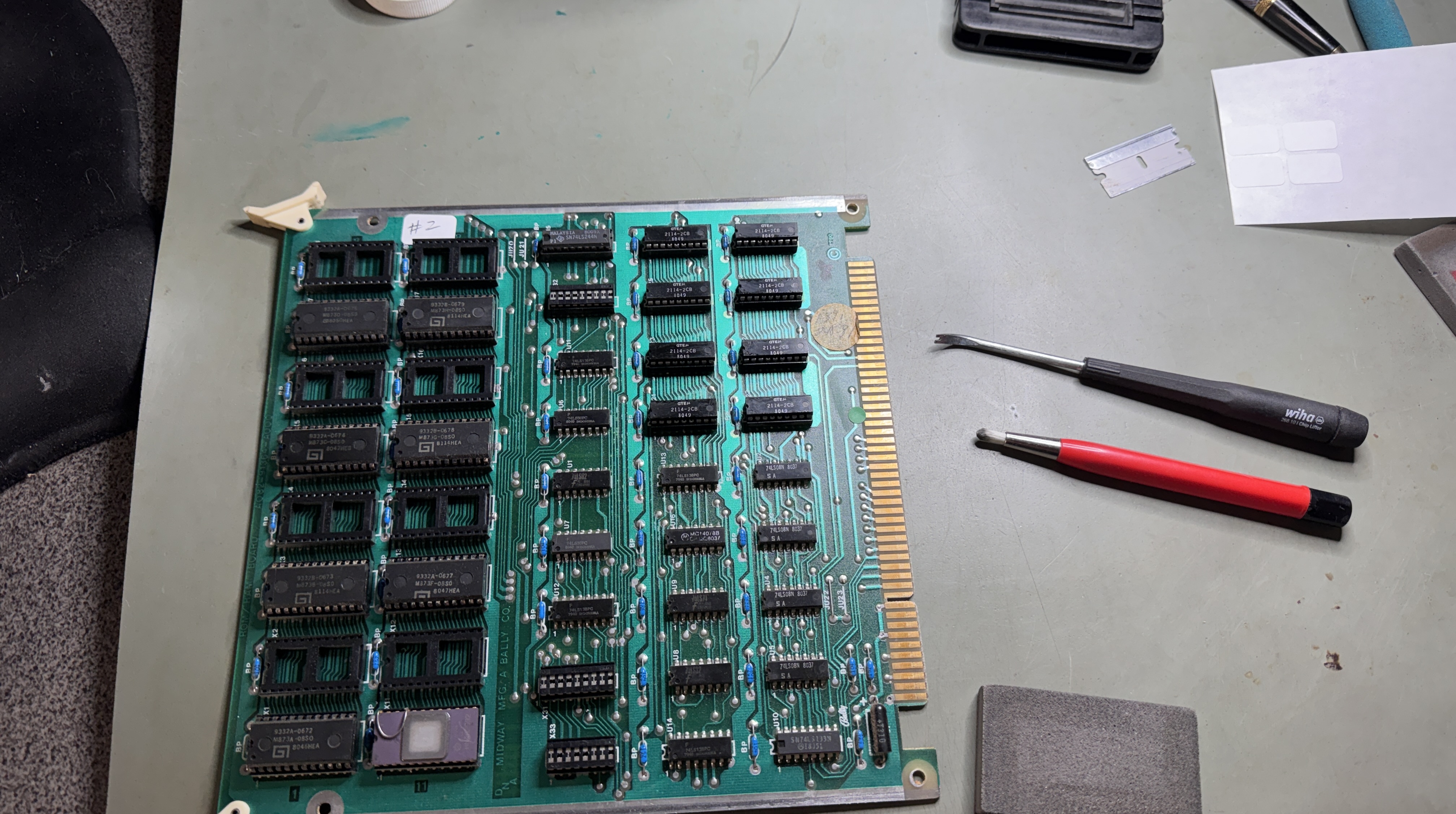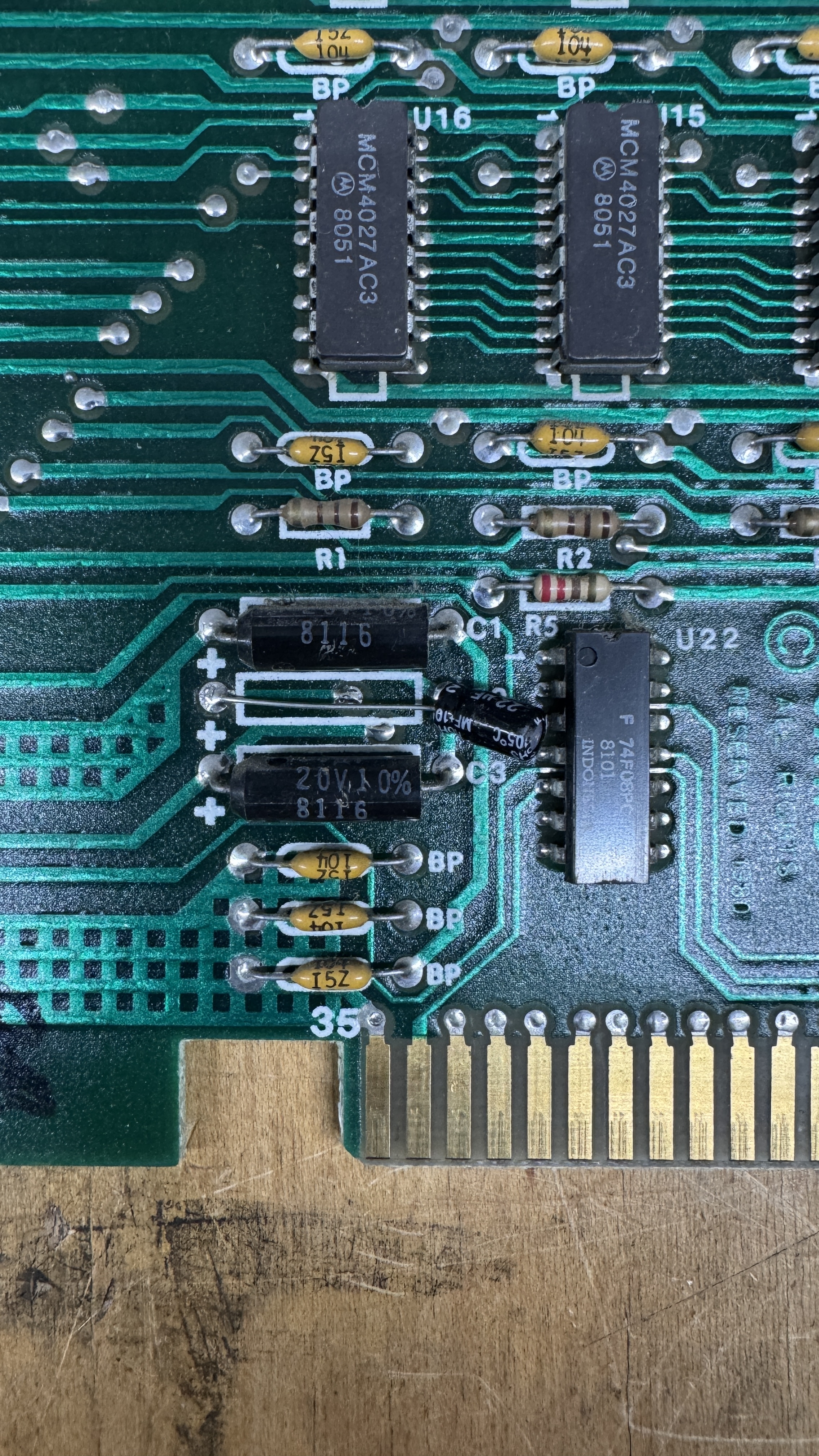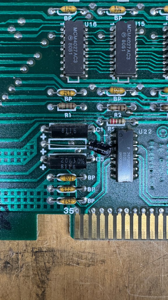 Since tantalums were a thing.. I tested all of them across all the boards – but specifically the ones carrying 12v.. Cap@C2 was shorted. Replaced it with what I had at the moment – but I want to put an axial in there when I get some ordered. RAM board fixed!