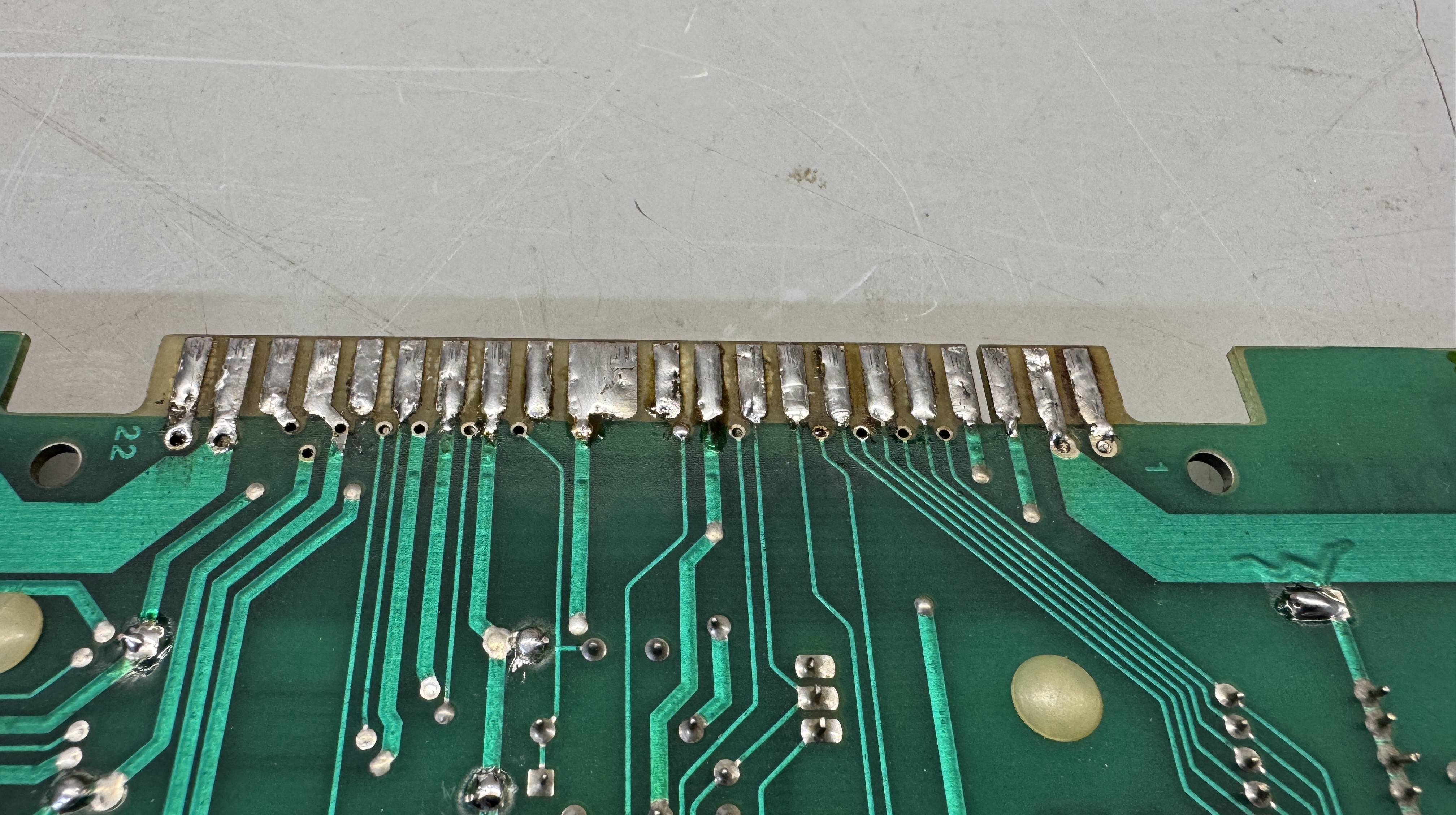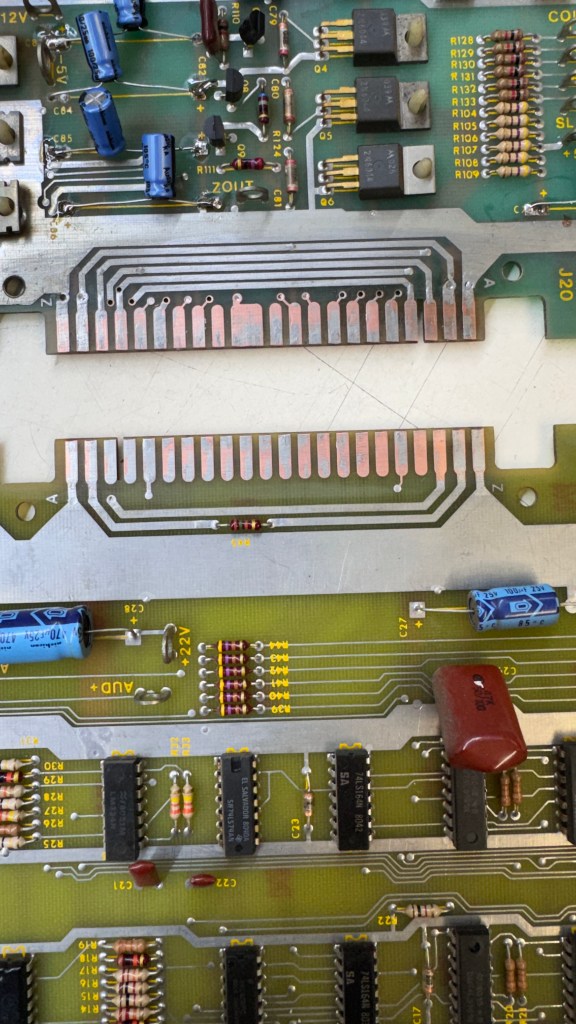 - The fingers on the PCB card edge had all been flowed with solder to ‘thicken’ them it seems. I’m guessing it came from a cabinet that had a loose edge connector. I removed the solder and the fingers below were perfect.