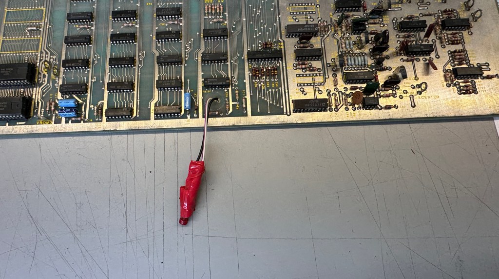 Look real close – pin 14’s address line had been cut at some point. Repaired with a small Kynar wire locked in place with UV cured resin. There was also a cut trace/repair with a jumper on the AUX board. I removed the wire and repaired the same way.