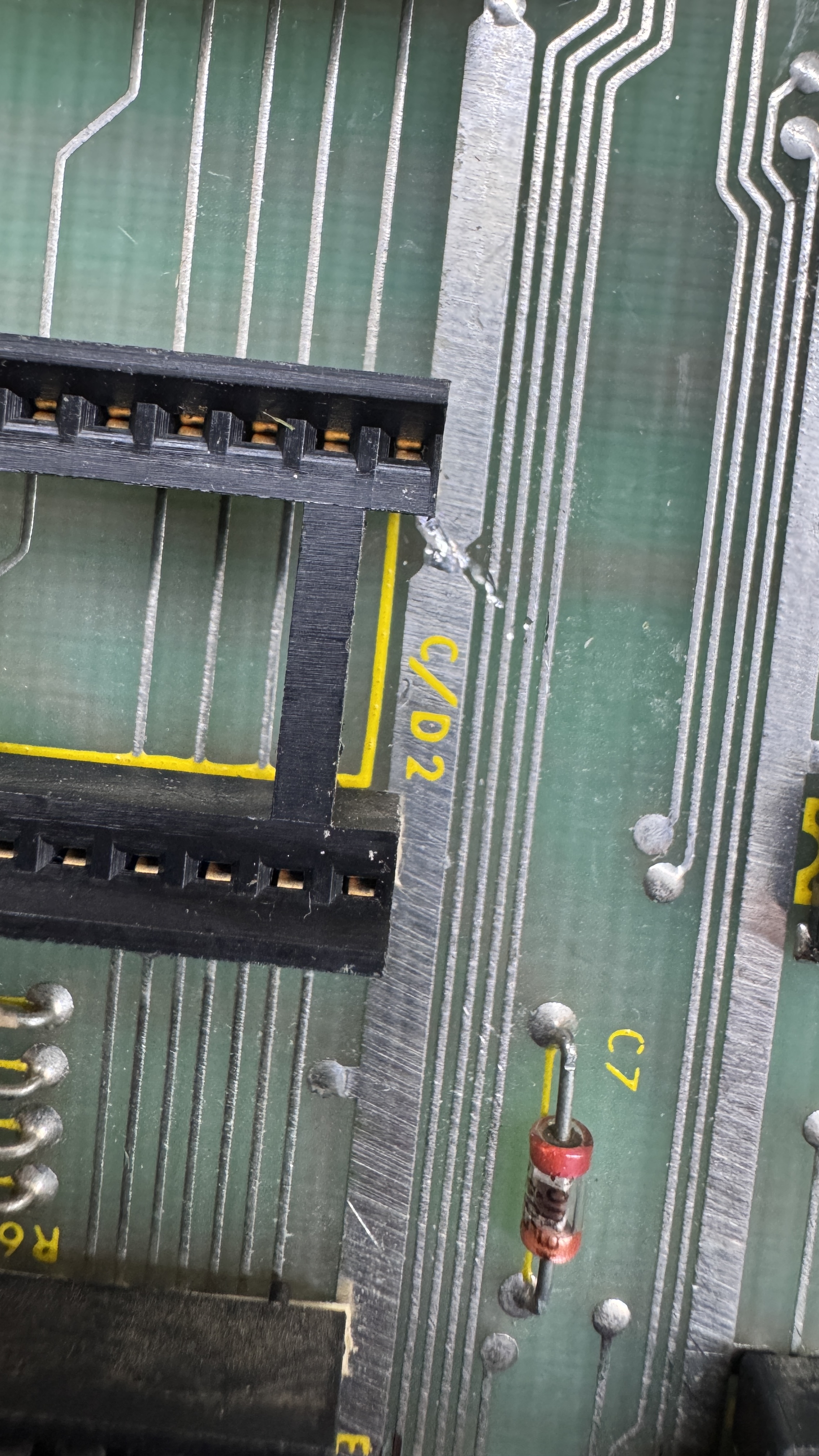 Under a couple of sockets, this was present. I cleaned this up and got the board to boot. But I’m certain it was caused by lack of reliability. I could get the board to crash by flexing it and all of the socketed chips were oxidized. From here I did my standard – remove all chips, clean legs, Deoxit and reinstall.