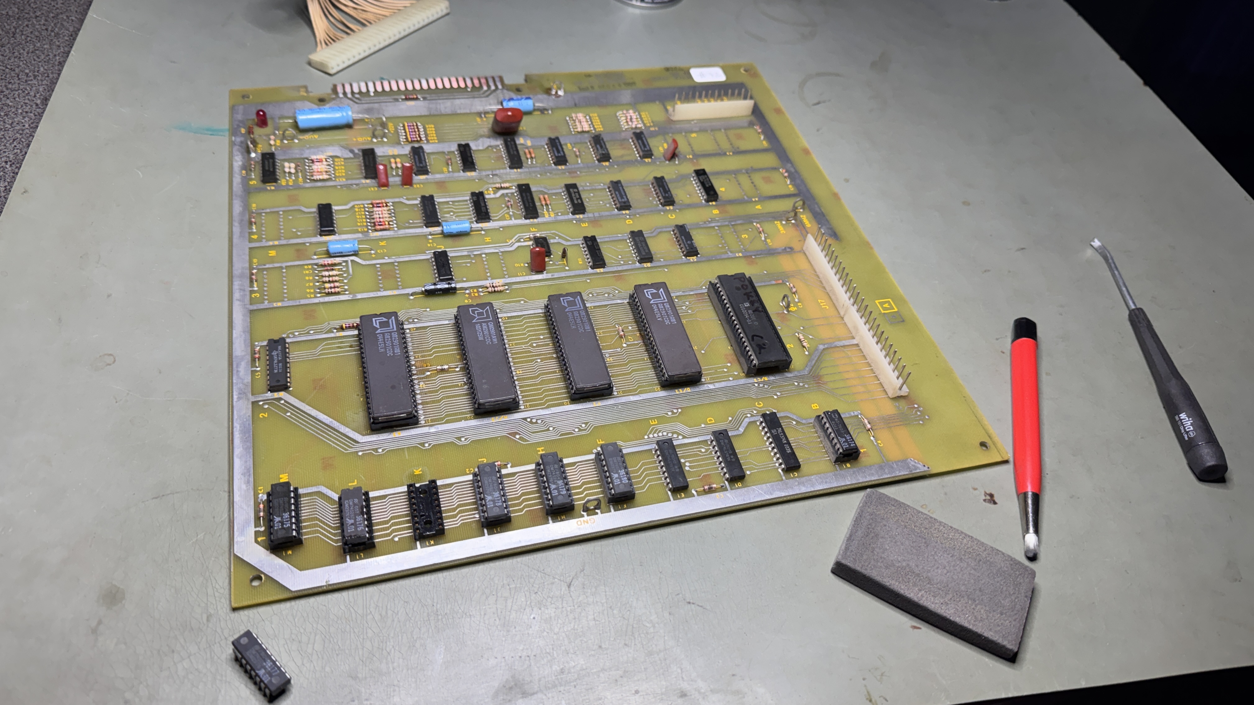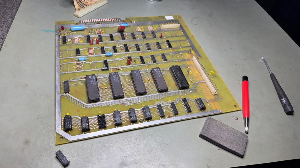 There were some cold solder joints at the header pins. I wire wheel them to shine them up and reflow. I also did my standard board maintenance removing all the chips (which were clean) .. buffed up the legs and Deoxit them and the sockets, then connected it up to the test harness.