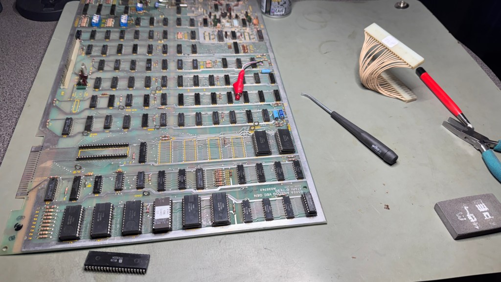 Even though this board was mostly working – I pulled all the socketed chips, cleaned the legs, verified the vector ROMs and the proms. No need to be chasing a software issue. While it was all apart – it got a good cleaning and Deoxit all around.