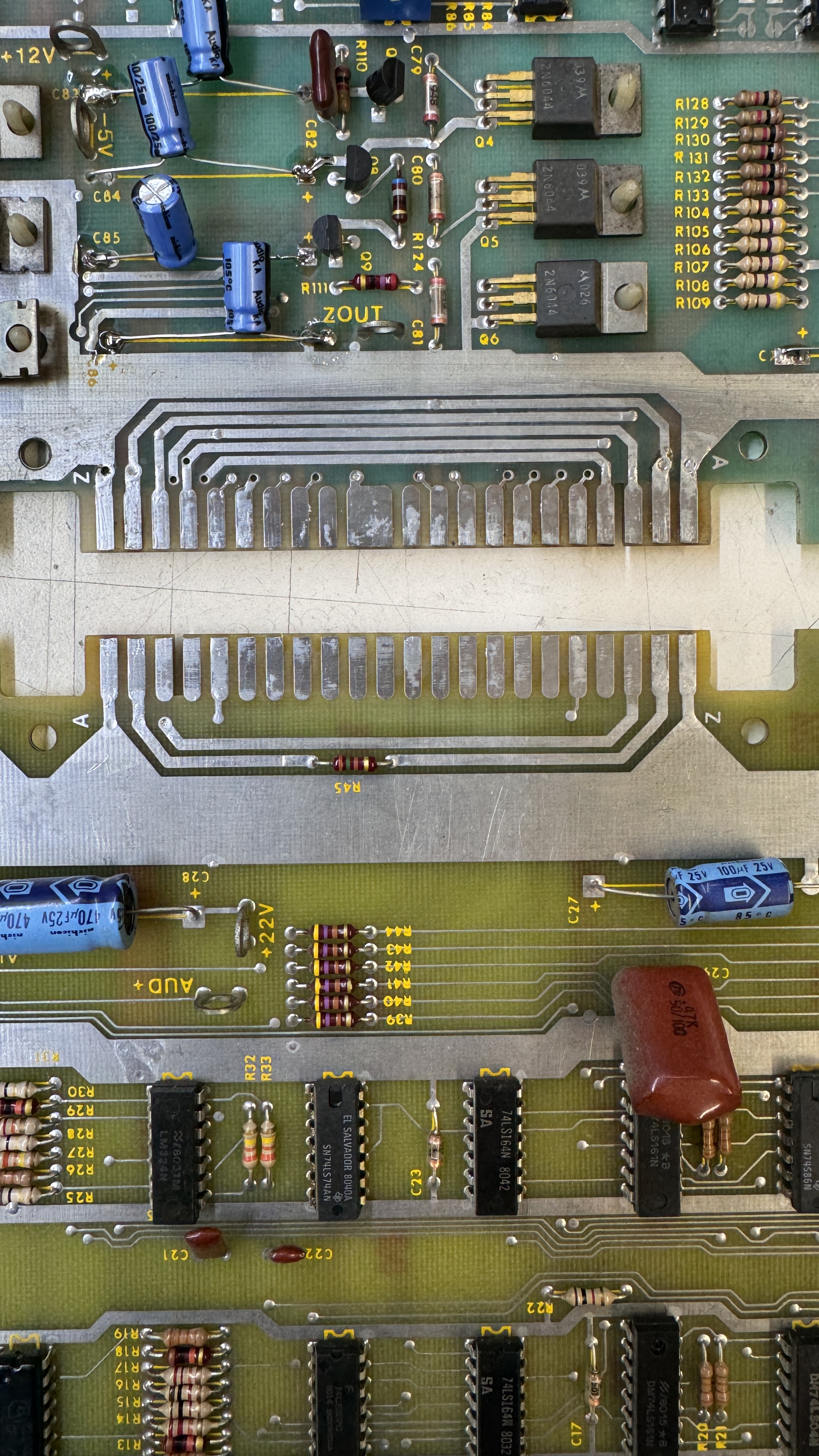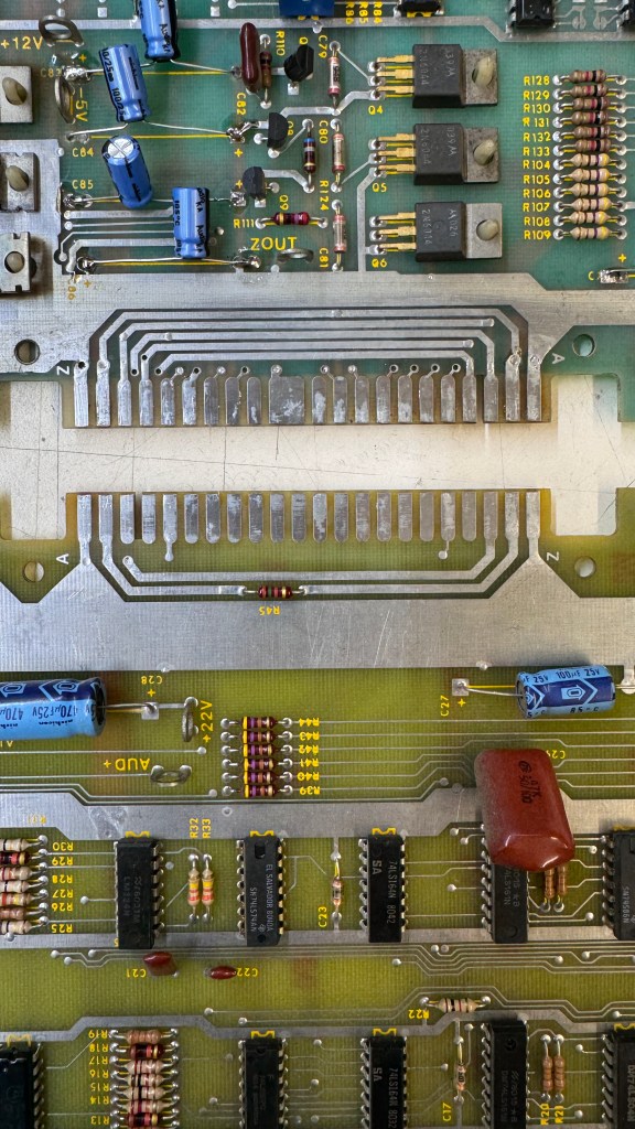The Aux board worked, but the sounds were messed up. Once I got back to it – I found that C29 had been ‘borrowed’ from this board at some point in its life. A .47uf Mylar cap. Once I replaced that – all the sounds worked properly again. A few other caps had been replaced with radials at some point. I swapped them out and put axial caps back as they were originally. The radials worked, but looked terrible.