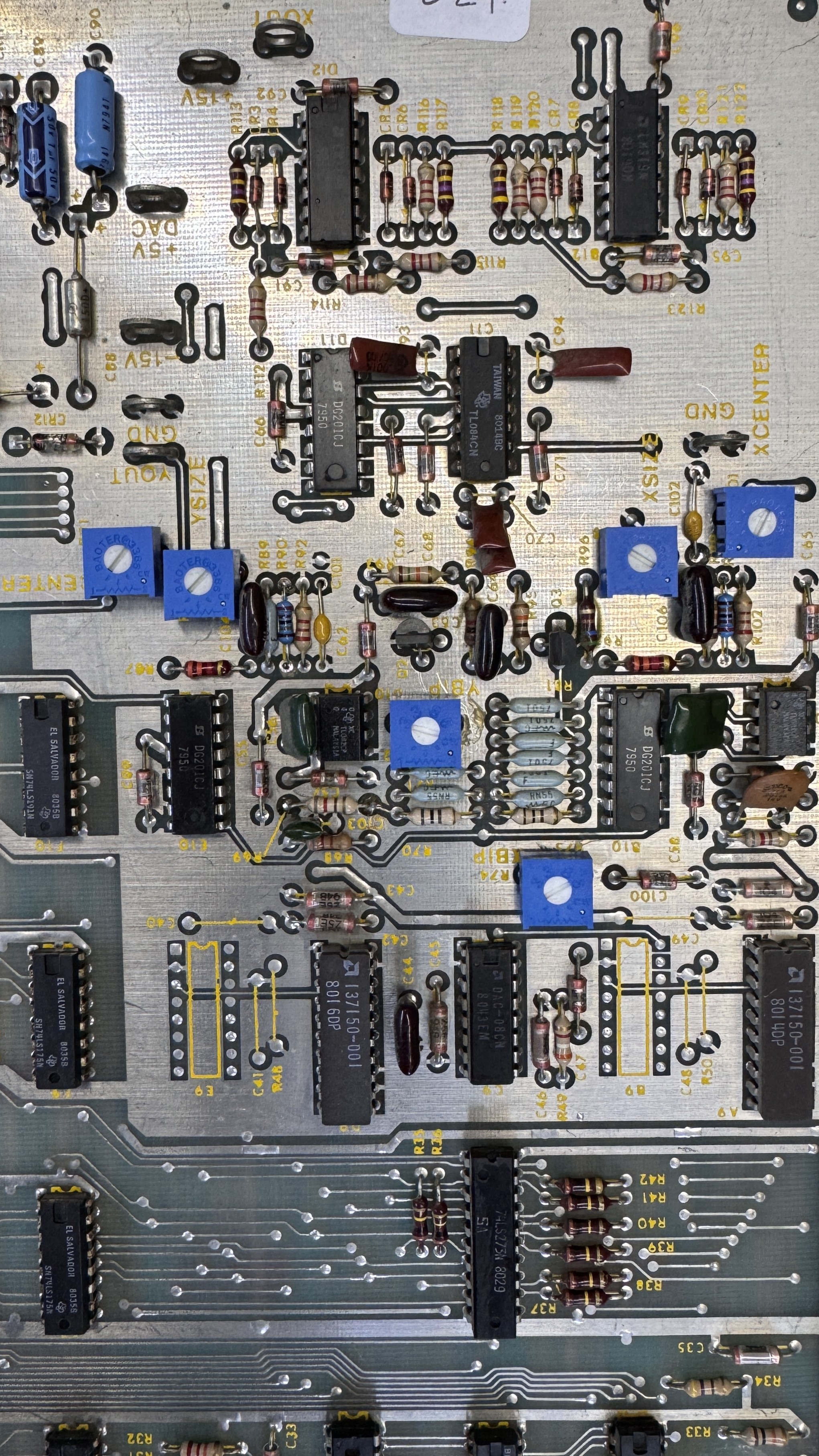 This trace smear turned out not to be an issue, but it is one of the things I look for. Lastly I remove all of the original stand up pots and replace them with sealed ones. I also ADD X and Y centering pots which were in the original design, but not installed on the final release of the boards. The allow you do adjust the screen without having to mess with the rings on the back of the monitor.