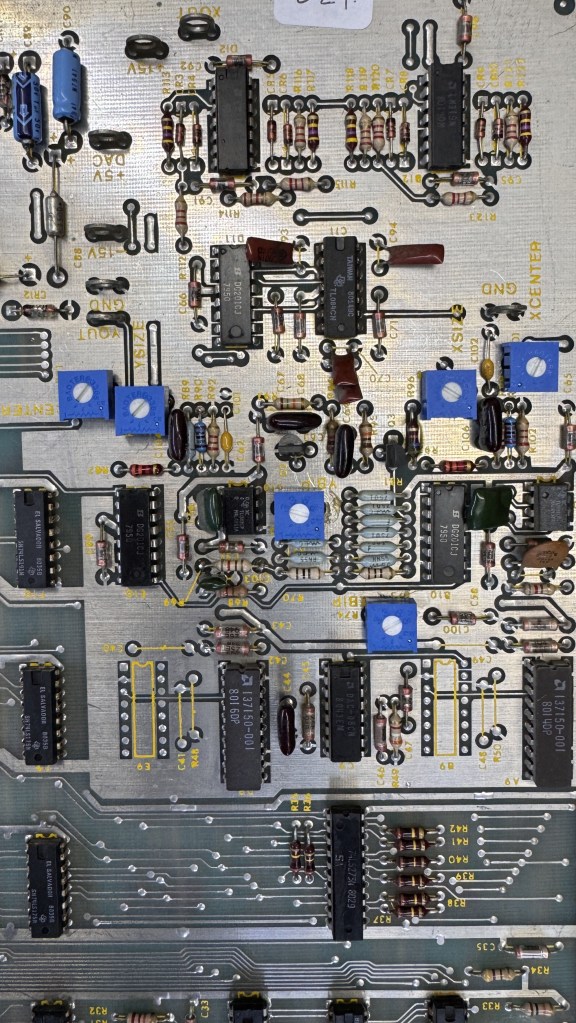 I’ve gone through all the IC’s in the analog section at this point and started swapping out capacitors. I’ve worked on this for a while and have not been able to isolate this issue. It appears to be analog in nature. One unique item (I think) is that the distortion is at one end of the vector. Even vectors that change length such as the rolling letters or the geometric shapes that move in out, the length of the distortion stays the same even though the vector gets shorter. I figured I messed something up during ‘the incident’.. I’ve checked lots of things, replaced all of the .1 and .01uf caps that surrounded the -15v chips (and some others).. No joy.