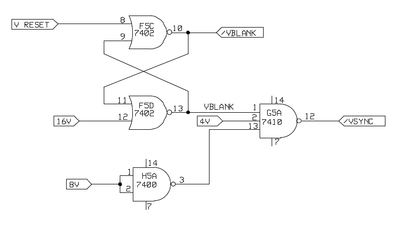 7400@E6 Pin6 was floating – replaced it. No changes. This is part of the game control circuits and controls the ball speed. (I believe. I didn’t spend any time here after replacing @E6). I was trying to get the ball visible and moving at this point. With the schematics broken up into these smaller units, it’s easy to see how they all work and then meet each other later in the design.