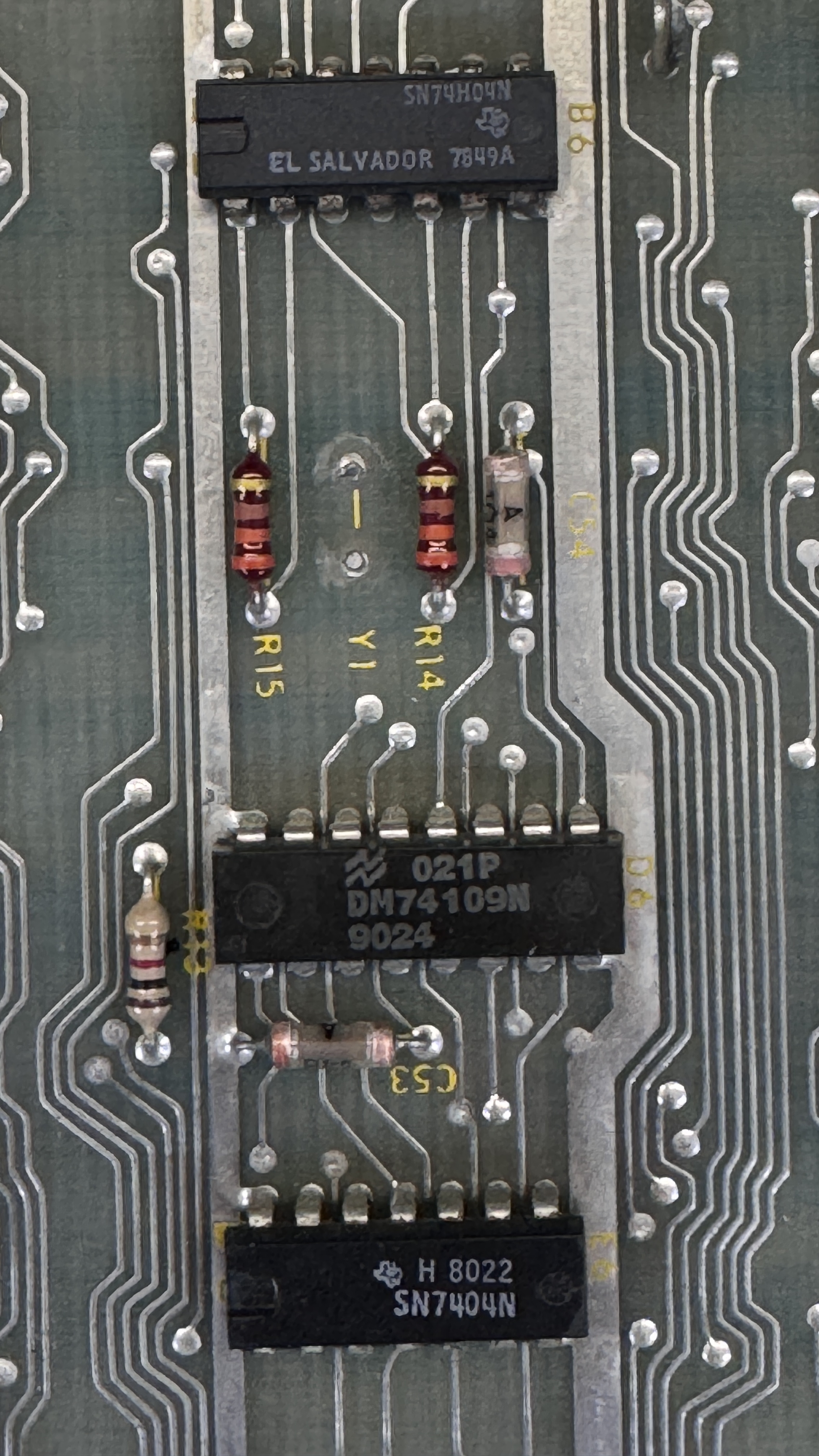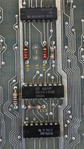 Here is the LS244@M9 that was suspect@Pin 1. After I removed it, the pin1 traces still showed 39 ohms. The only chip left was the 7404@K7 Pin1. The worst part is it isn’t doing anything in this circuit, but it was the offending chip dragging this signal down. Replacing it resolved all the issues.